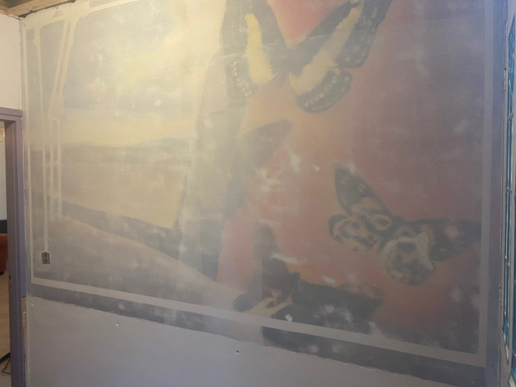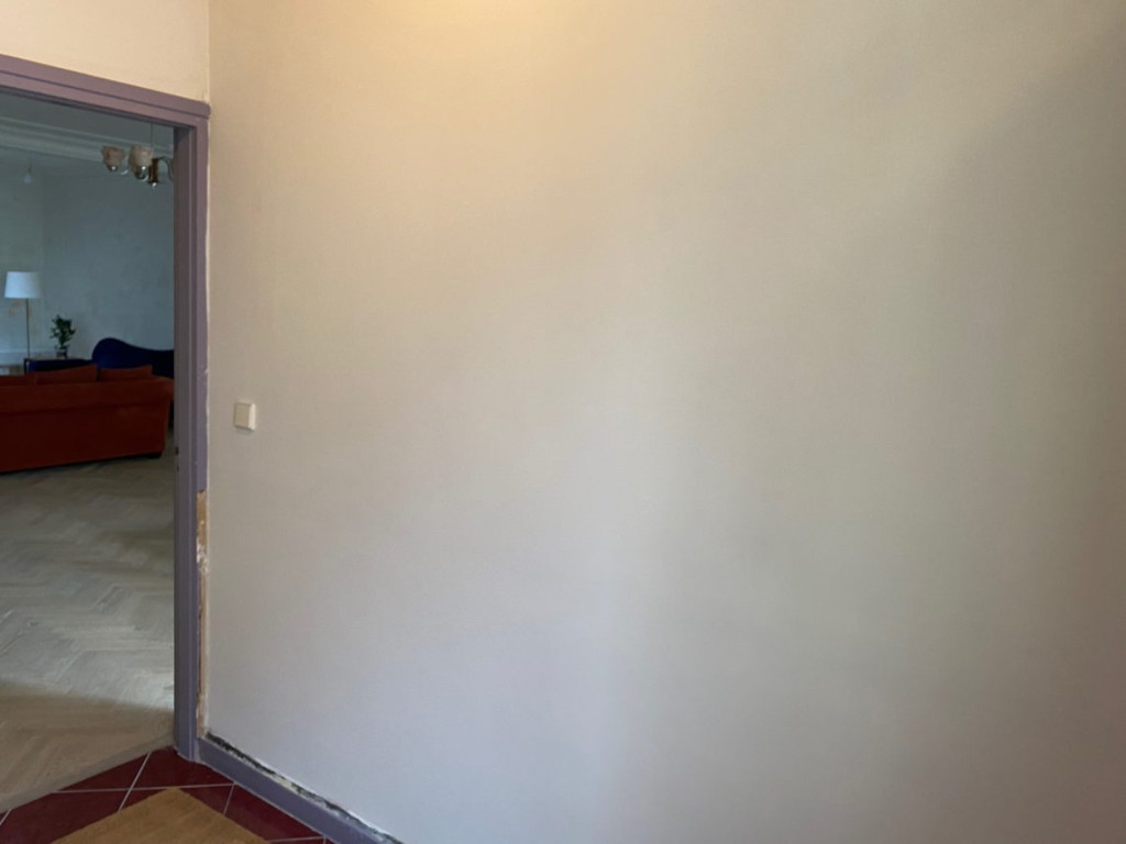 Als eerste was de Tattoo muur aan de beurt. Daar had ik sleuven in geslepen voor de elektra. Die sleuven heb ik dichtgesmeerd, en daarna heb ik de muur in de witte verf gezet.