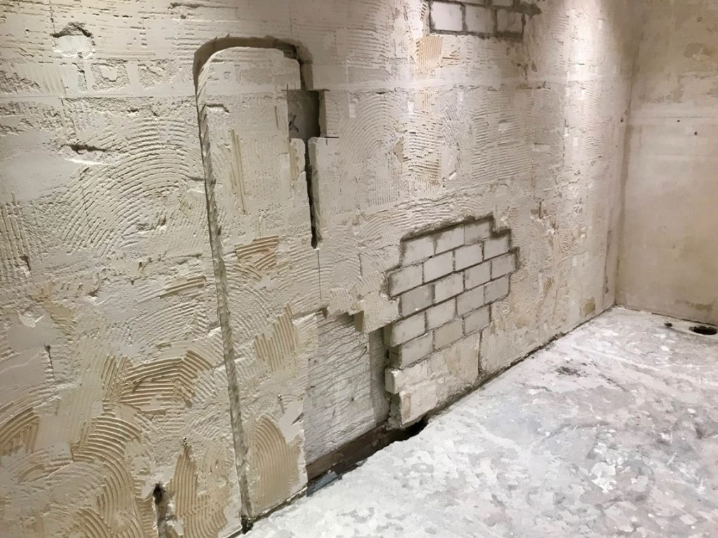 De rechterwand van de badkamer vroeg niet al teveel aandacht. Daar komt een voorzetwand voor, en in die wand kunnen de meeste leidingen weggewerkt worden. De linkerwand is een ander verhaal. Daar hebben de vorige bewoners al eens een wandje van bakstenen die met de smalle kanten op elkaar gemetseld zijn voorgezet. Dat is eigenlijk een tamelijk beroerd systeem geweest, want door kleine verzakkingen is dat wandje hier en daar gescheurd. Ik heb er een week of wat geleden al de nodige reparaties aan uitgevoerd.