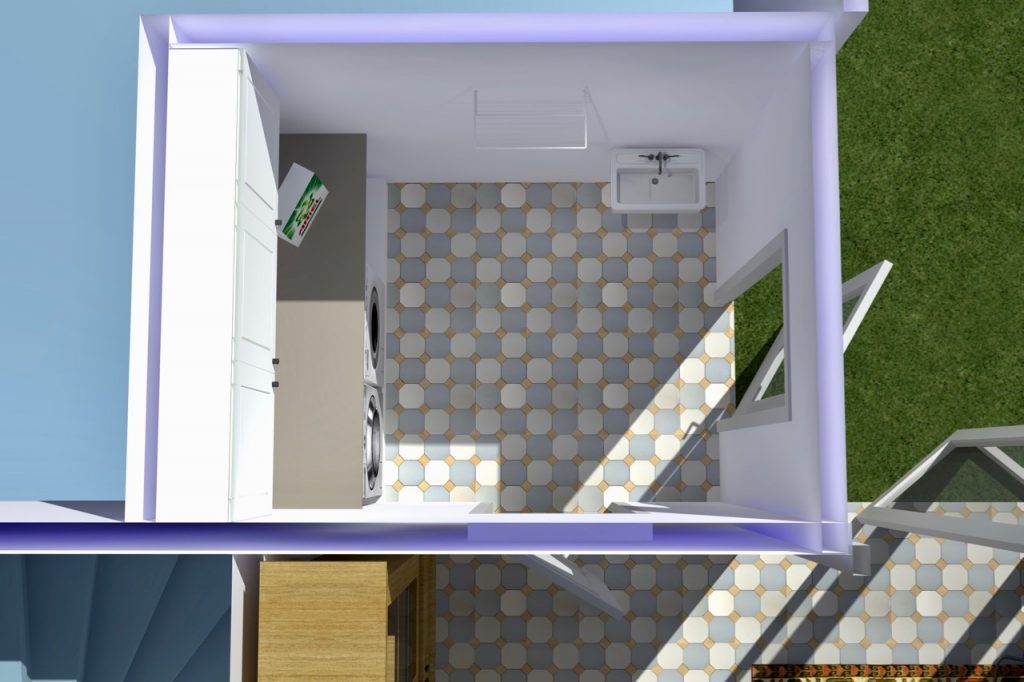 Je komt binnen door de deur, die naar buiten toe (in de keuken) open gaat. Dan meteen links de wasmachine en droger, op een kleine verhoging zodat we niet zo hoeven te bukken. Daarboven een werkblad. Misschien een kastje. Aan de lange muur komt een waslijn (lekker praktisch) en dan naast de buitendeur een spoelbak met warm en koud water. Dat had mijn oma vroeger ook op de boerderij volgens mij. Hartstikke handig.