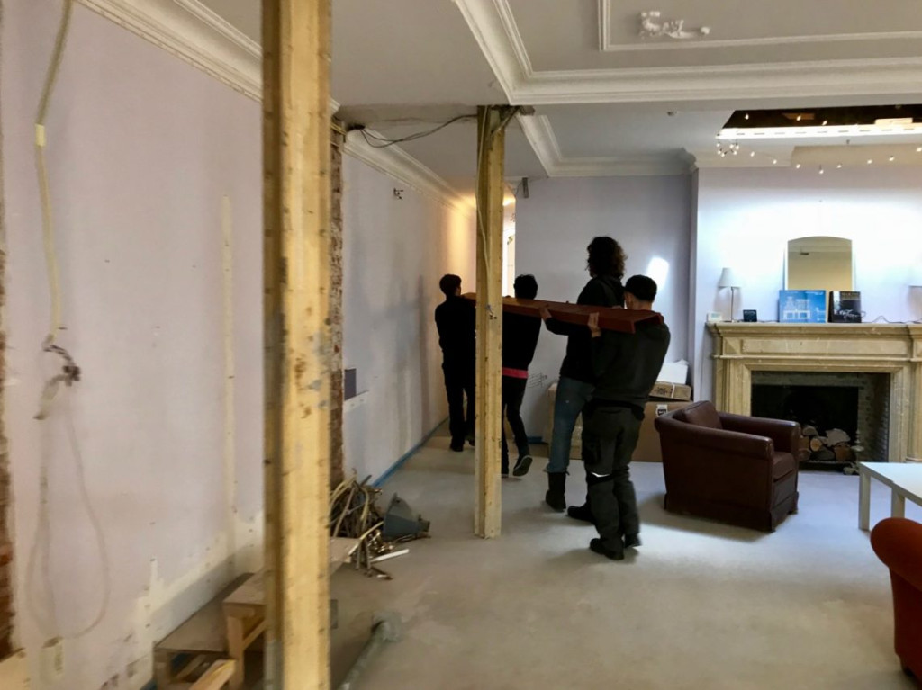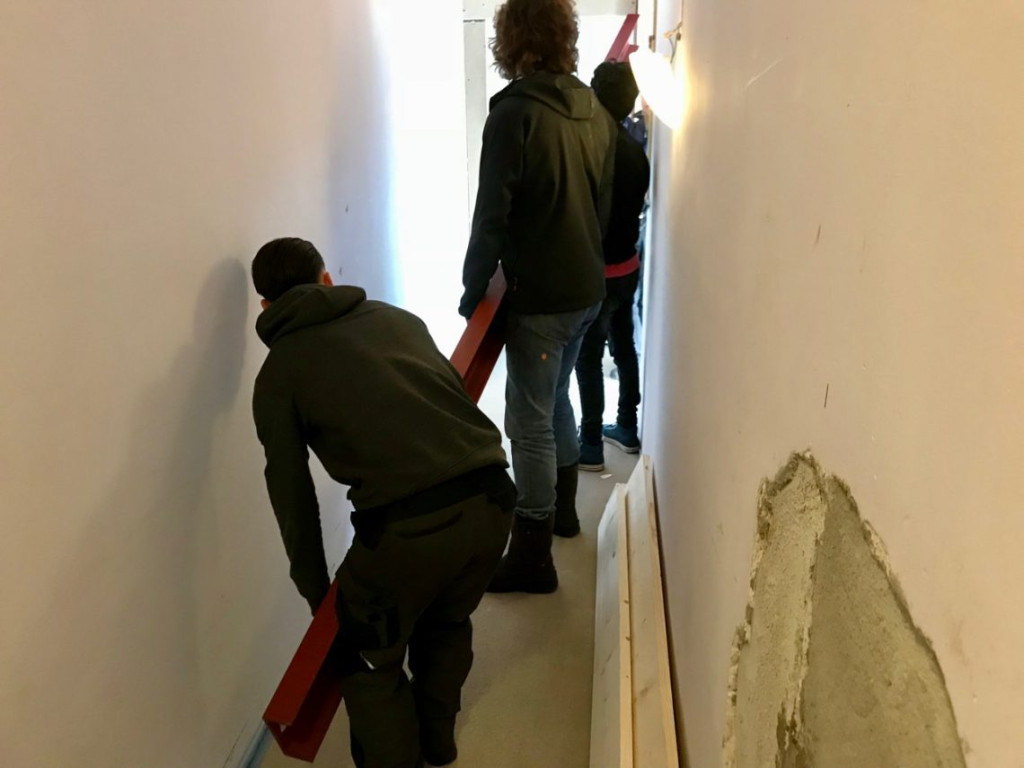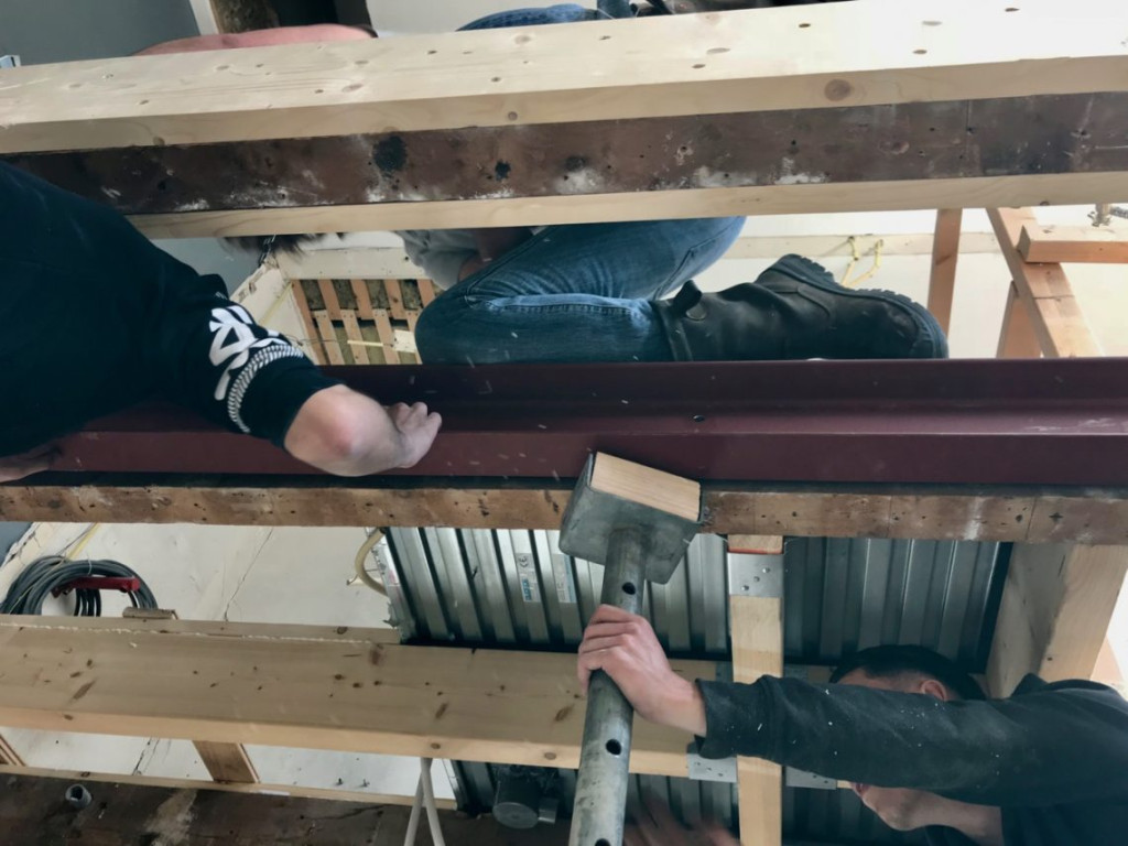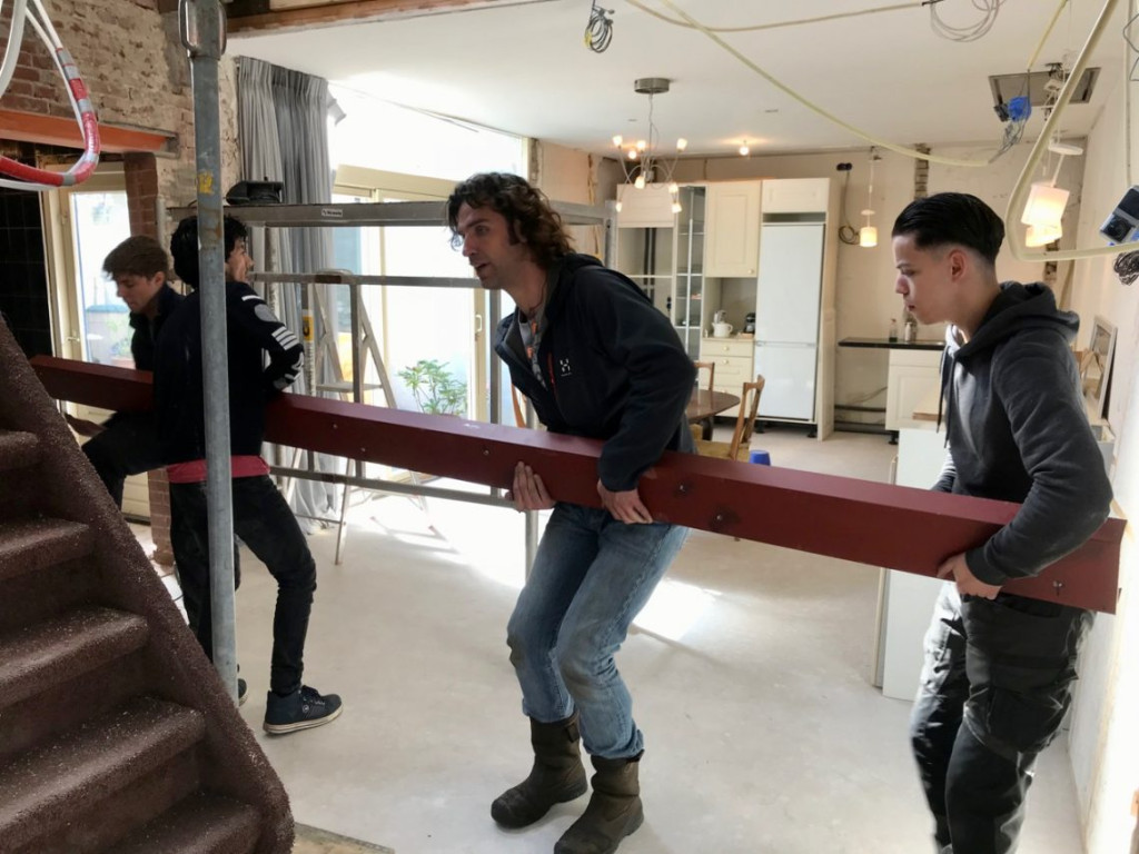 Ja hoor, dat lukte. En daar stonden ze dan, in de keuken, vier man en een stalen balk van 120 Kilo. Wat nu te doen?