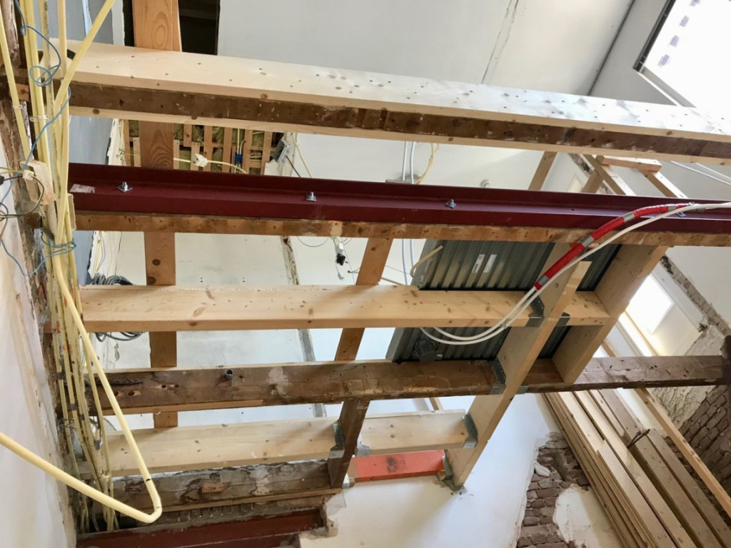 De balk werd opgetild, op de dwarsbalkjes gelegd en met stellatjes precies op hoogte gebracht. Sjimmie had al gaten in het staal geboord, op aanwijzingen van Duyts Constructeurs, nu hoefden er alleen nog maar corresponderende gaten in de houten balk geboord te worden. Draadeinden door alle gaten, bulldogkramplaten, sluitplaten en een handvol moeren, en de stalen balk zat vast.