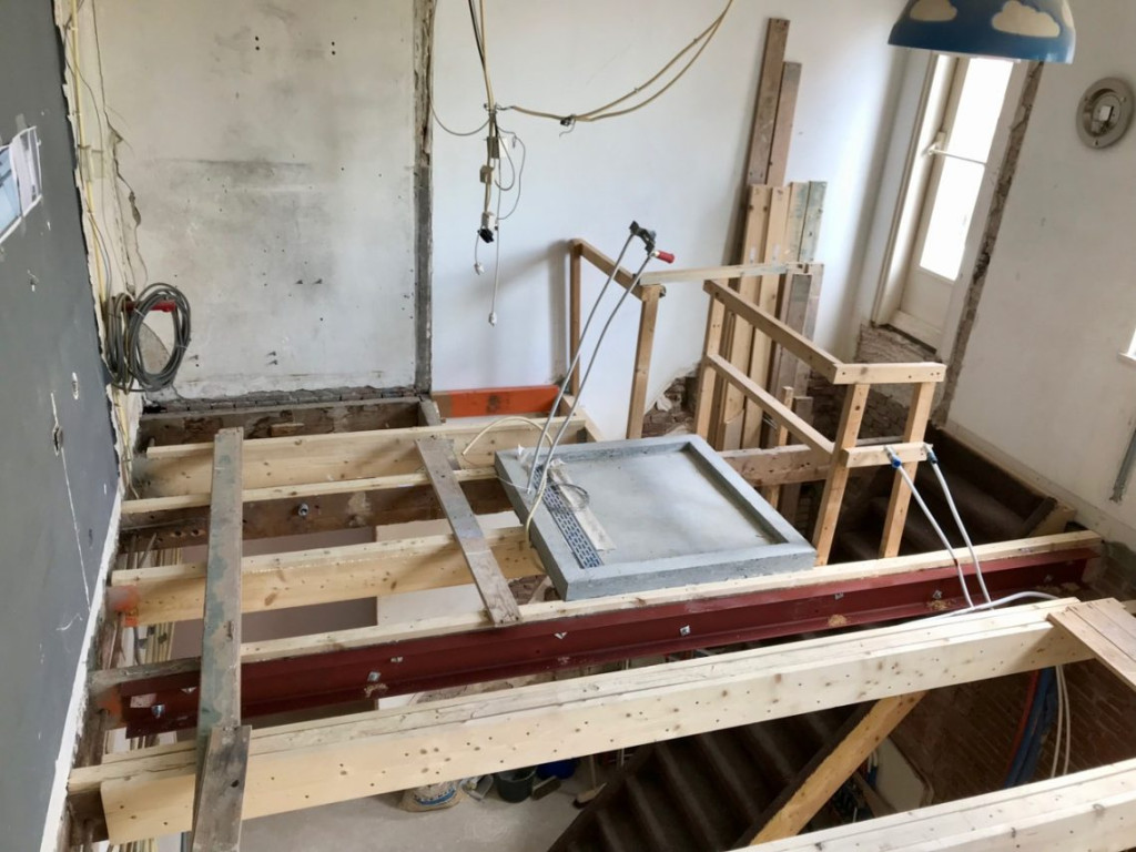 Hessel, ik denk dat ik wat gemist heb, maar wat is de functie van die stalenbalk? Hij ligt niet op de muren toch? Welke blog ging hierover?
