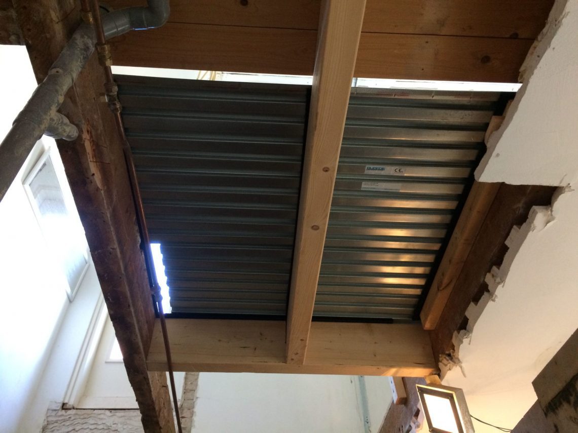 Bovenop de raveelconstructie die ik een tijdje geleden gemaakt had is vandaag de douchevloer voorbereid. Op de balken is eerst een laag kunststof rubber gemonteerd. Voor de geluidsisolatie, en tegen condens. Daarop liggen de zwaluwstaartplaten, beter bekend als Lewisplaten. Deze platen zijn van metaal, en hebben een geribbeld profiel. Op die platen stort je beton, en samen wordt het dan een stevig bewapend vloertje.