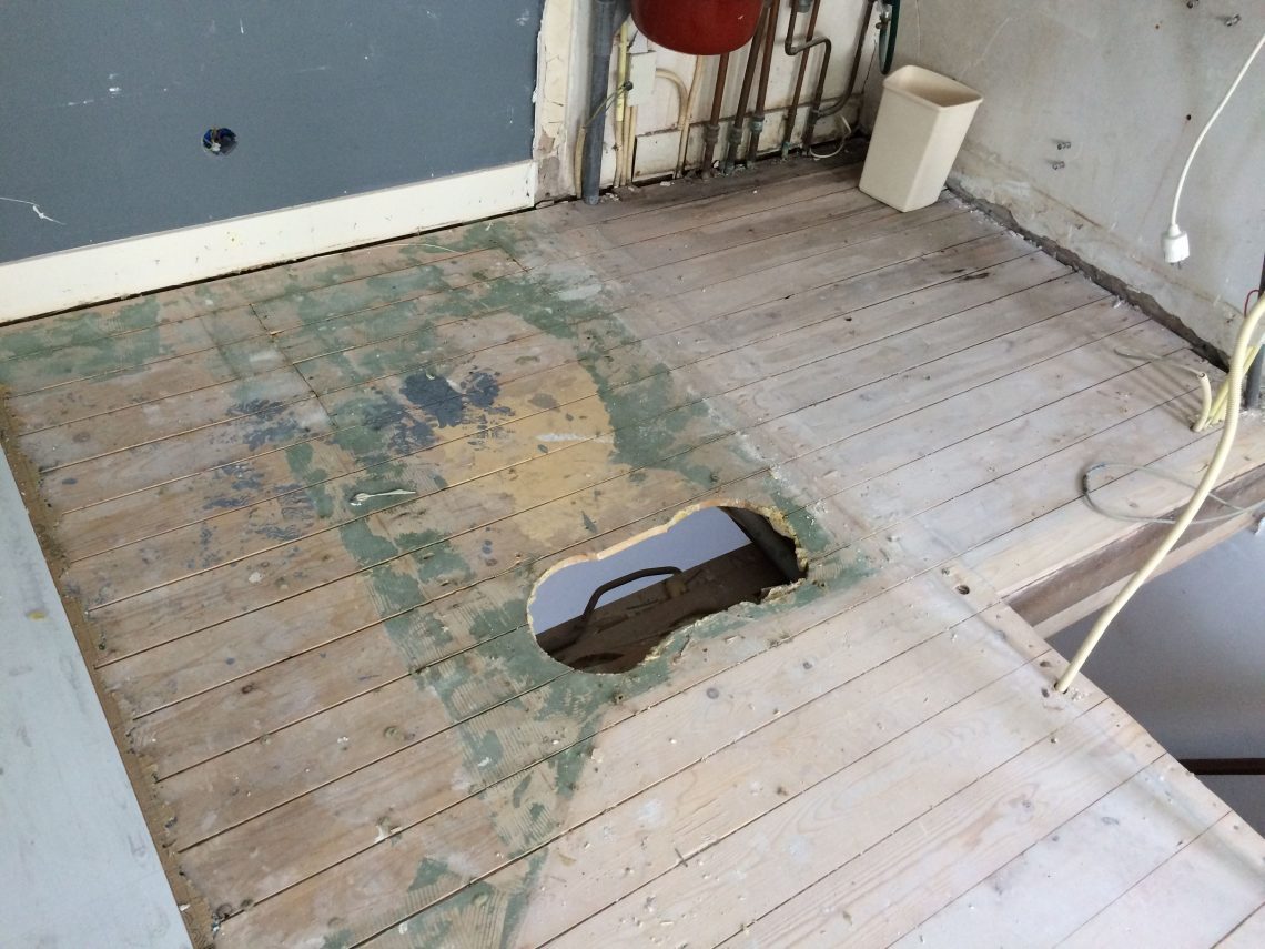 Het toekomstige trappengat wordt elke dag wat beter zichtbaar. Vandaag haalde ik wat oude vloerbedekking op de slaapetage weg, en vond toen een brilvormig gat in de vloer. Het was dichtgemaakt met balkjes, stukken gipsplaat en voldoende Pur-schuim, maar toen ik dat allemaal gedemonteerd had, kon ik leuk in de ruimte tussen vloer en plafond van de keuken kijken. Overal PVC leidingen met elektra kabels.