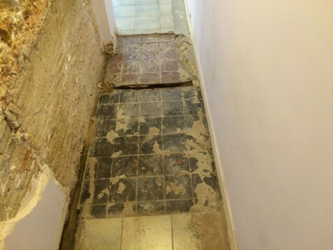 De gang moet straks een langzaam oplopend recht vlak worden. Ik was vorige week al begonnen met het weghakken van de meest vreemde hobbels, en heb dat werkje nu afgemaakt. Eén van de wanden, die waar ik de muur van heb afgebikt, sloot niet op de vloer aan. Hier en daar kon je tussen de muur en de vloer de diepte inkijken. Daar heb ik nu een hele geul uitgehakt. Op sommige plekken ligt de vloer keurig op het zand, op sommige plekken kun je je hand tussen zand en beton steken. Ik heb besloten om nieuwe materialen toe te passen op een oud fundament: PUR-schuim.
