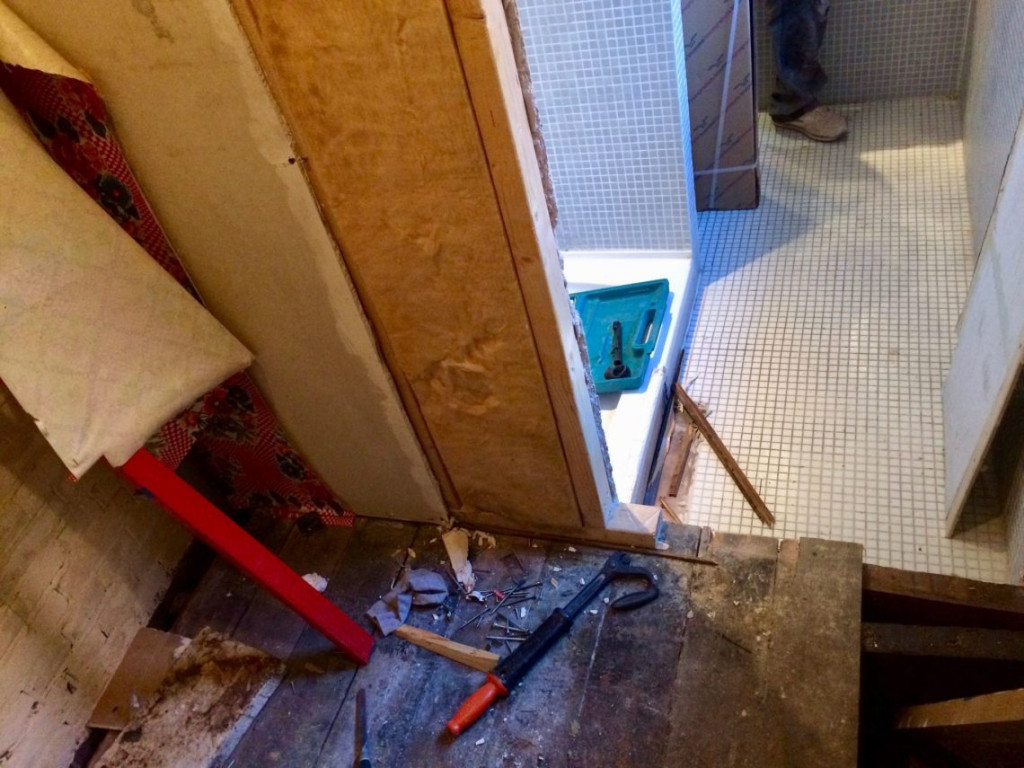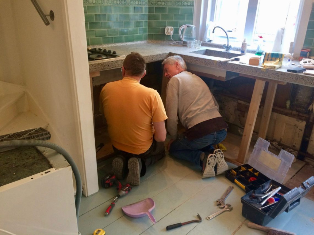 Toen Mariusz de oude keukenkastjes demonteerde kwamen miljarden muizenkeutels hem tegemoet. Maar ook de wonderlijke stank waar we het al eerder over hebben gehad. Wat bleek: de leiding van de afwasmachine zat los in de standpijp (moet eigenlijk met een speciale aansluiting) en het zou zomaar kunnen dat hierdoor een soort rioollucht vrij kwam, wat je steeds ruikt als je de trap op komt. Echt superfijn dat we daar dan nu achter zijn, en Mariusz met gemak een nieuwe pijp kan maken. Nadat hij eea even heeft besproken met “Mister Hessel” natuurlijk.