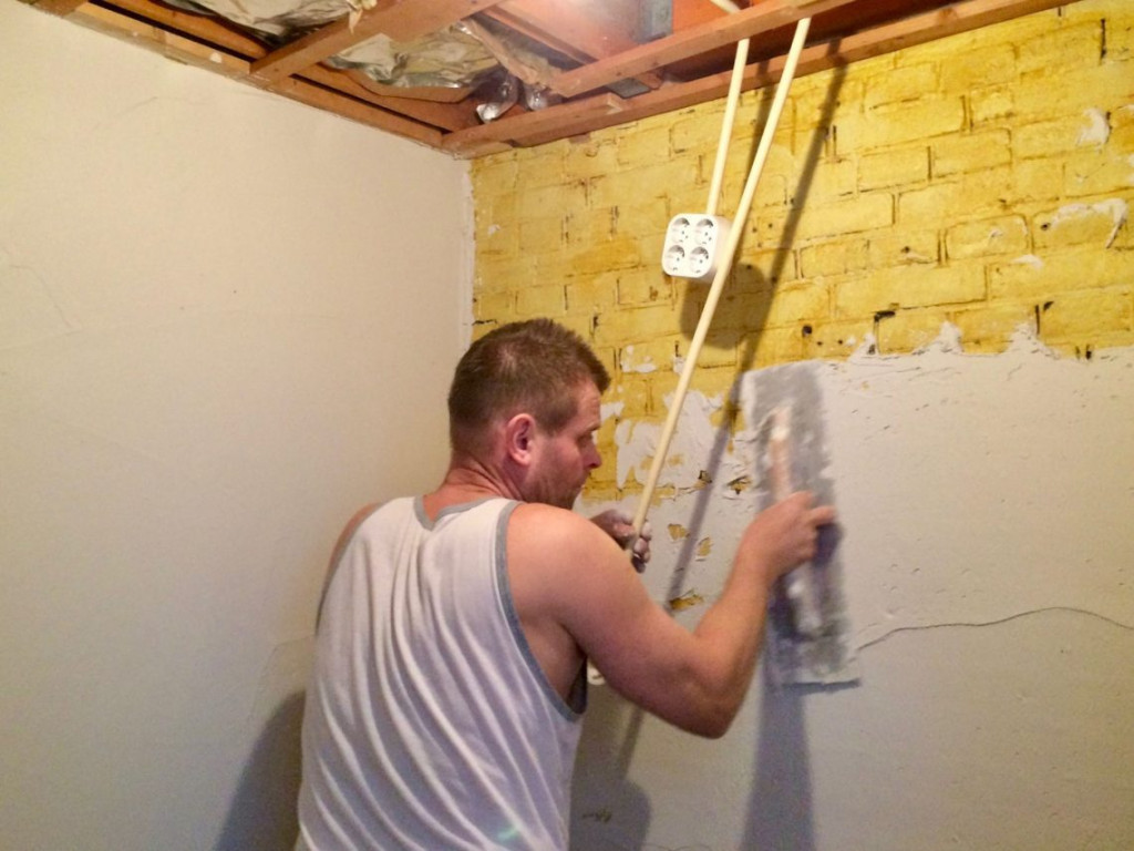 Toen Hessel en ik vandaag via de achterdeur naar voren liepen zagen we Mariusz en zijn collega al klaar staan voor de deur. Heel leuk om hen weer te zien. Hessel kent Mariusz al 10 jaar en ze hebben al veel klussen gedaan samen. Met z’n vieren ging het meteen heel snel. Zbisjek nam ‘het wasmachine kamertje’ op zich en maakte daar een keurig gestucte unit van.