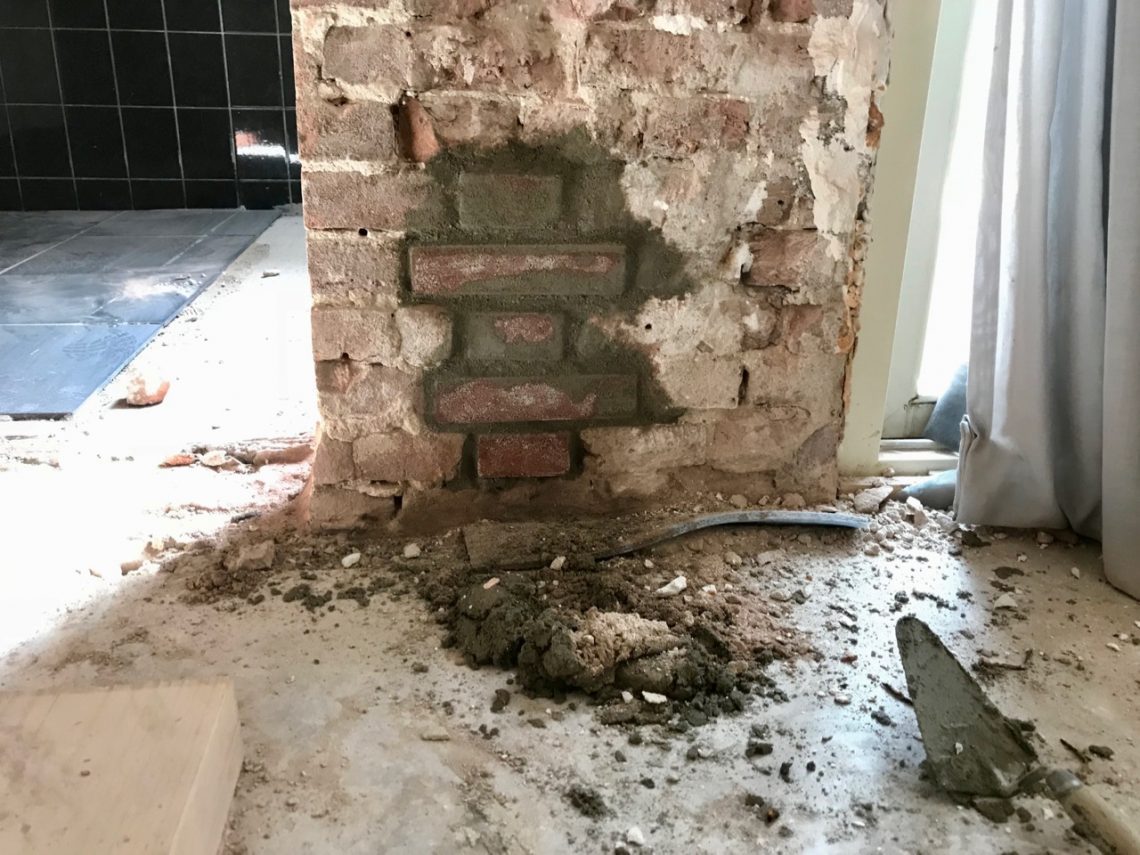 De binnenmuur was 100 jaar geleden gelijk met de buitenmuur gebouwd. Dat hadden ze toen degelijk gedaan. Na elke zes rijen bakstenen van de buitenmuur, lieten ze zes rijen van de binnenmuur deels in de buitenmuur verzinken. De restjes die nu nog over waren, zaten niet erg vast meer. En omdat ik mijn “penant”, zoals de kolom bakstenen waar de metalen balken op steunen heet, zo stevig mogelijk wilde maken, heb ik de oude stukjes binnenmuur helemaal weggebikt, en heb er nieuwe bakstenen voor in de plaats gemetseld. Een ontzettend priegelwerkje, want je wil natuurlijk niet door je muur heen bikken, en je wil ook graag dat het gat voor de nieuwe baksteen precies groot genoeg is, maar het klusje is vandaag naar tevredenheid afgerond.