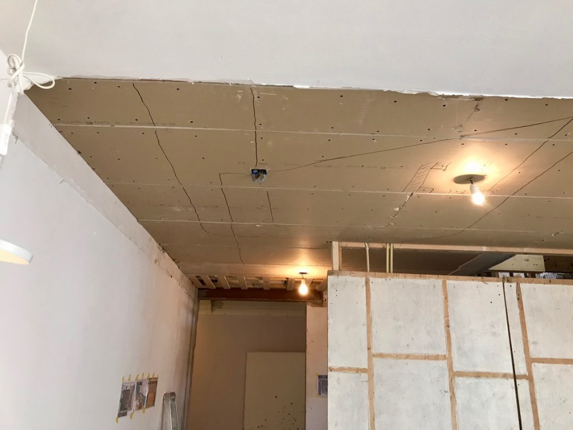 Goed, het keukenplafond heeft inmiddels bijna helemaal zijn eerste laag gipsplaten. Alleen het stukje bij de gang heb ik nog even leeg gelaten. Morgenochtend komt er een specialist van een elektrisch installatiebedrijf langs. We hebben zelf wel plannen voor onze deurintercom, maar ik wil toch zeker zijn dat we later niet precies de verkeerde kabel gebruikt hebben, en zodoende laat ik een “second opinion” er ook nog even naar kijken.