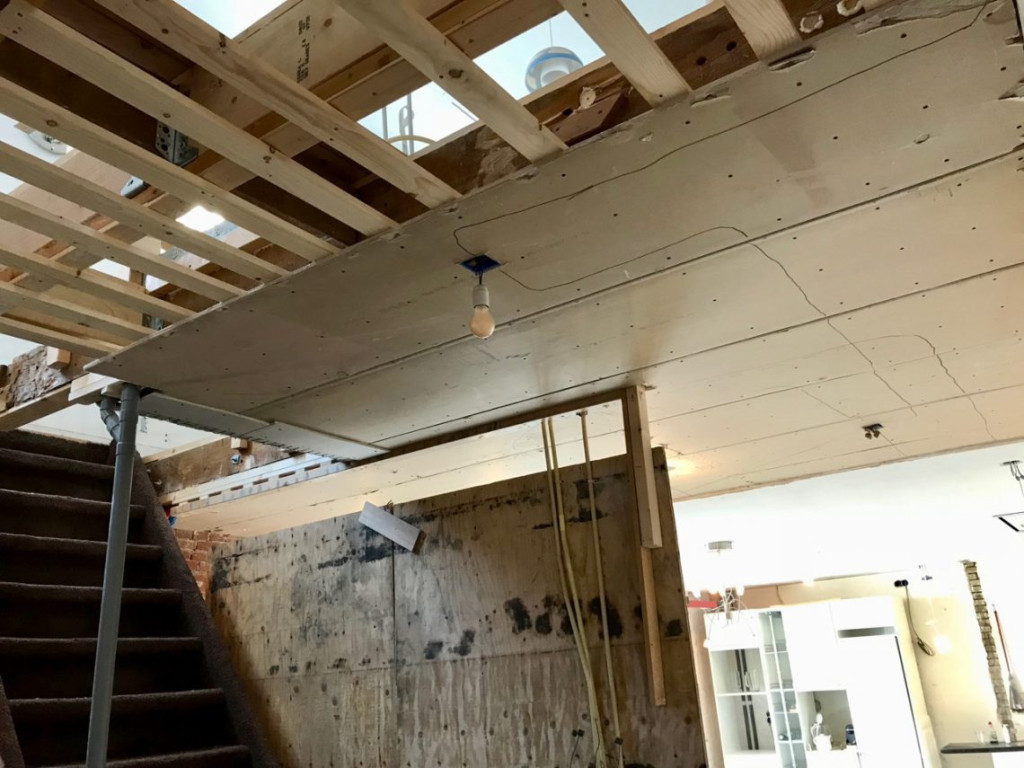 Goed, het keukenplafond heeft inmiddels bijna helemaal zijn eerste laag gipsplaten. Alleen het stukje bij de gang heb ik nog even leeg gelaten. Morgenochtend komt er een specialist van een elektrisch installatiebedrijf langs. We hebben zelf wel plannen voor onze deurintercom, maar ik wil toch zeker zijn dat we later niet precies de verkeerde kabel gebruikt hebben, en zodoende laat ik een “second opinion” er ook nog even naar kijken.