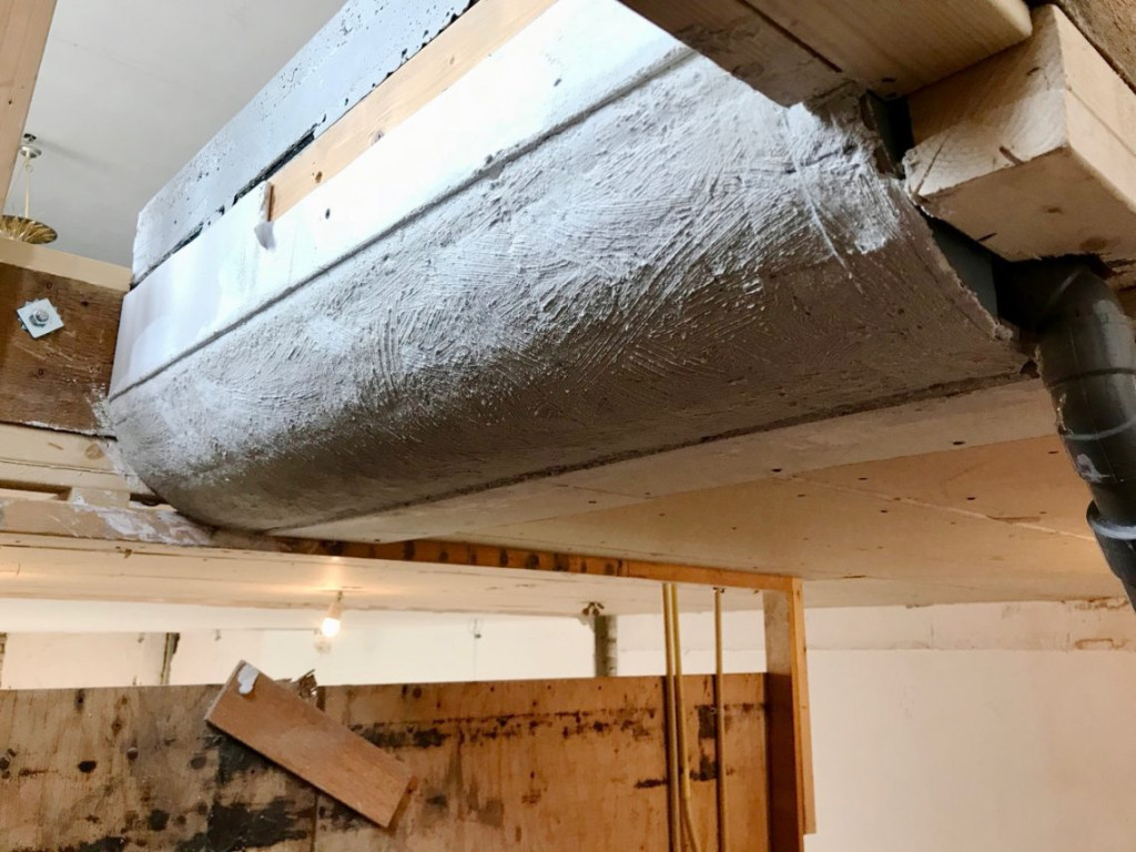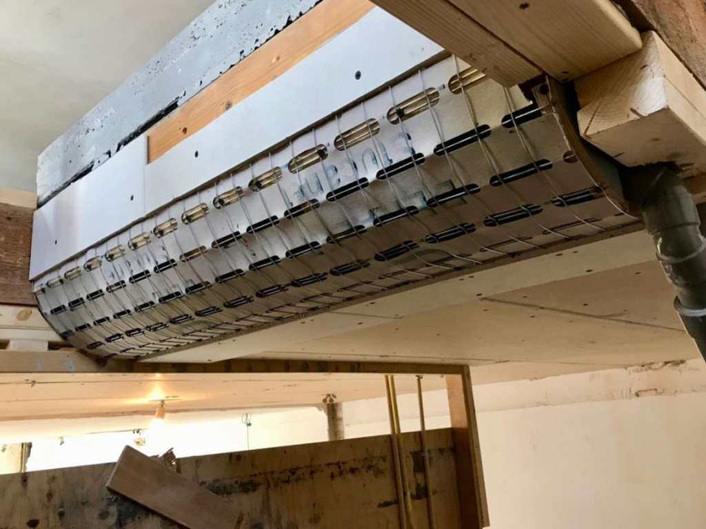 Ik had de afgelopen dagen al een soort mal gemaakt, waar het stucanet keurig overheen gebogen kon worden. Ik moest even prutsen om te ontdekken hoe het zich liet verwerken, ik maakte een meetfout waardoor het opnieuw gedaan moest worden, maar toen zat het allemaal keurig op z’n plaats. Aan beide kanten van het net zie je een klein stukje extra gipsplaat geschroefd. Die stukjes beelden de toekomstige tweede laag gipsplaten uit. Zodoende wist ik precies hoe dik ik straks moest gaan stucen.