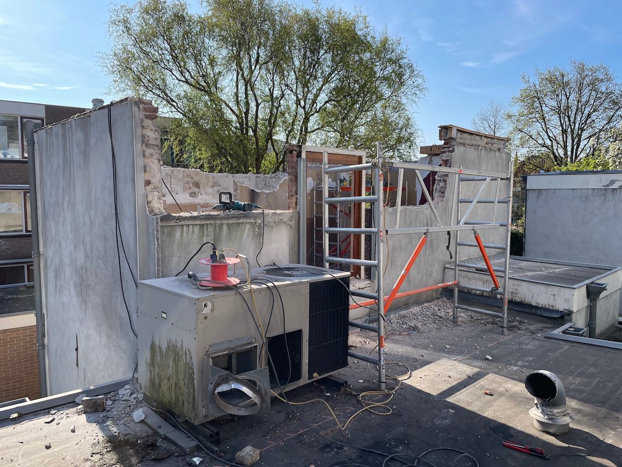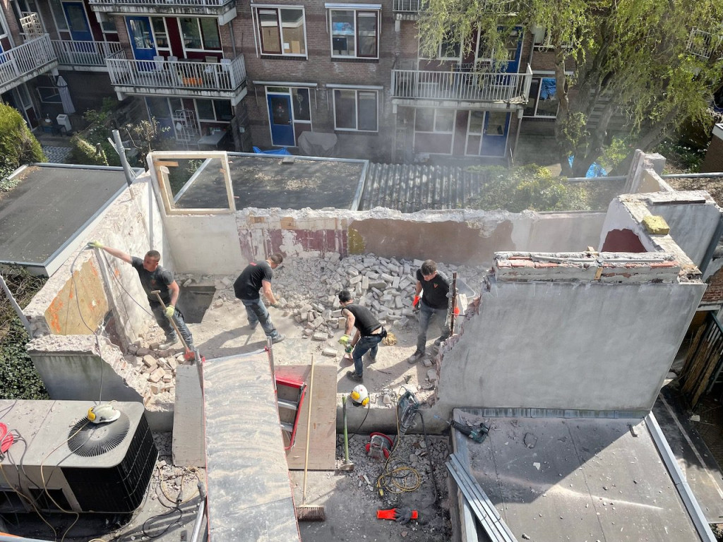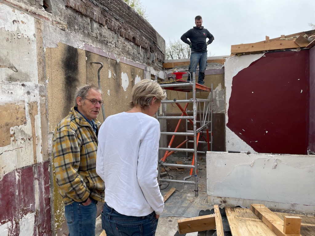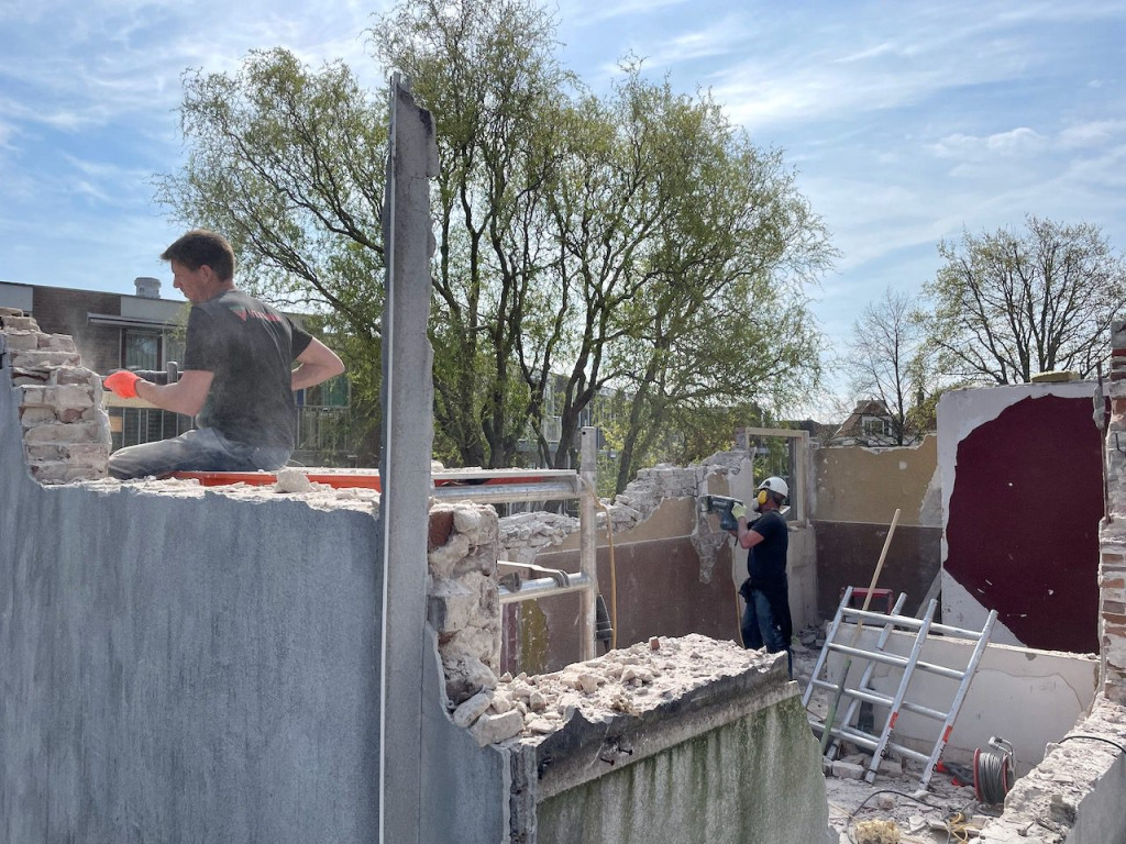 Ik heb de hele week als een kip zonder kop tussen de werklieden doorgewandeld. Het is heel vreemd om zelf niks te doen. Het lukte me gelukkig wel heel goed om me niet overal mee te bemoeien. De Vlasmannen weten zelf al waar ze mee bezig zijn. Het is een compleet bouwproces, maar dan achterstevoren. Normaal denk je goed na welke krachten er spelen als je iets op gaat bouwen, nu moet je goed bedenken wat het betekent als je iets afbreekt. Kan je dan later nog steeds bij dat ene hoekje komen? Krijg je niks op je hoofd? Stort er niks in?