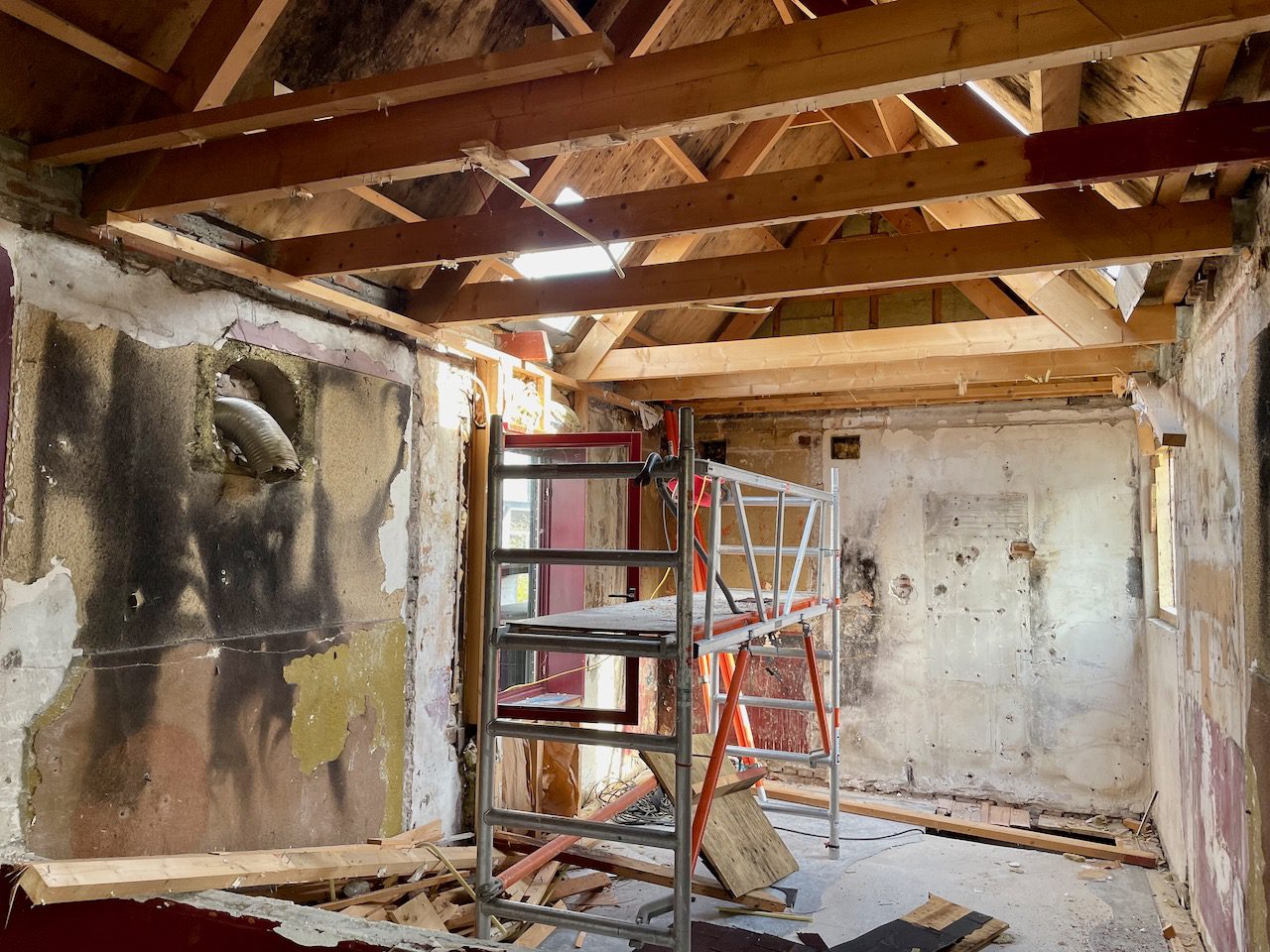 Het plafond op de begane grond werd langs de stippellijn afgezaagd. Het kale stuk links gaat nog helemaal verdwijnen, het zwarte plafond rechts wordt straks de masterbedroom.