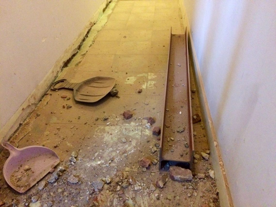 Kort en goed, daar moet een stalen balk boven de doorgang gaan komen om de constructie weer helemaal veilig te maken.