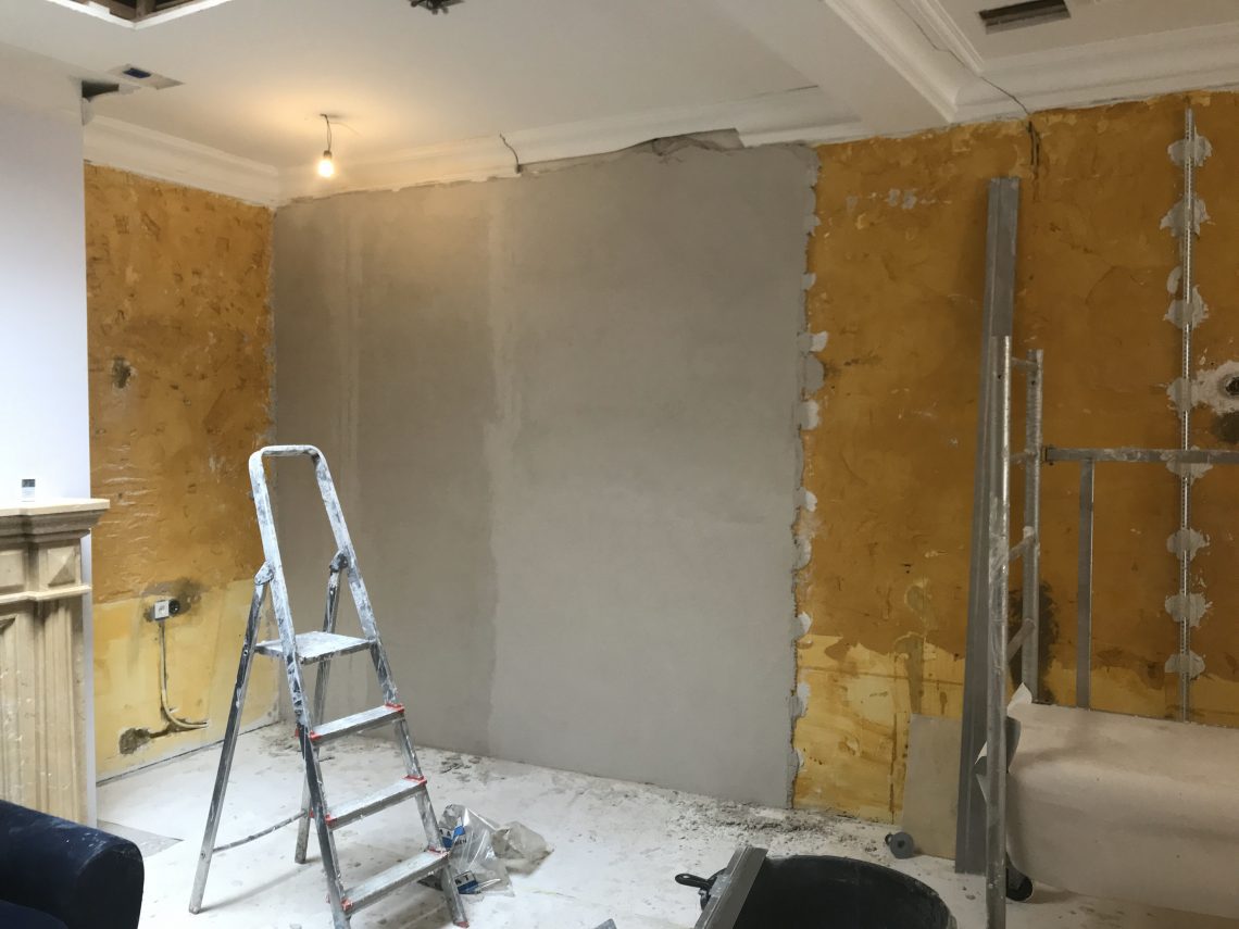 En die stuukprofielen die ik gisteren om de 1 meter 40 bevestigd had? Wat leverden die op? Helaas niet de door mij berekende 2 zakken per vak. Ik moet op deze muur veel meer smeren dan op de vorige muur. Dat was dus wel een nieuwe vorm van gedoe. Nu kon ik niet netjes een vak helemaal afwerken, maar moest tussendoor nieuw stuuk aanmaken. Enfin, alle begin is moeilijk zal ik maar denken.