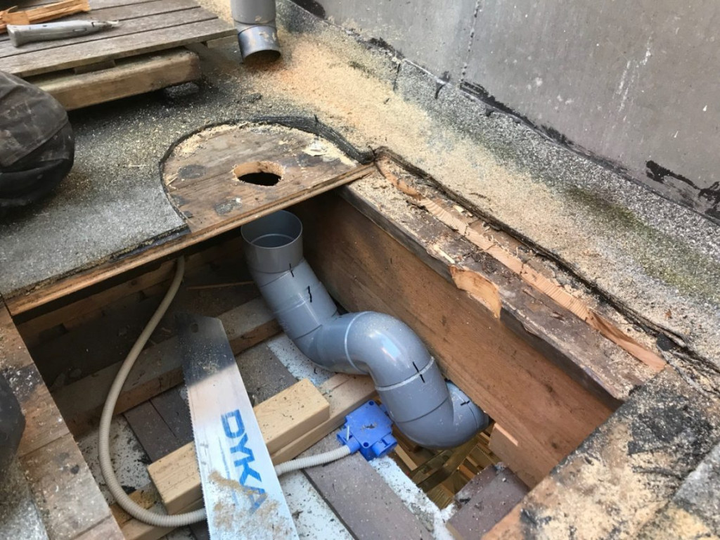 Eerst de oude zooi verwijderen. De afvoer bleek een omgekeerde schoorsteen te zijn. Wonderlijk.