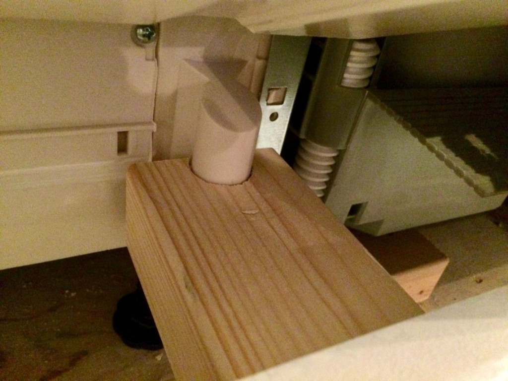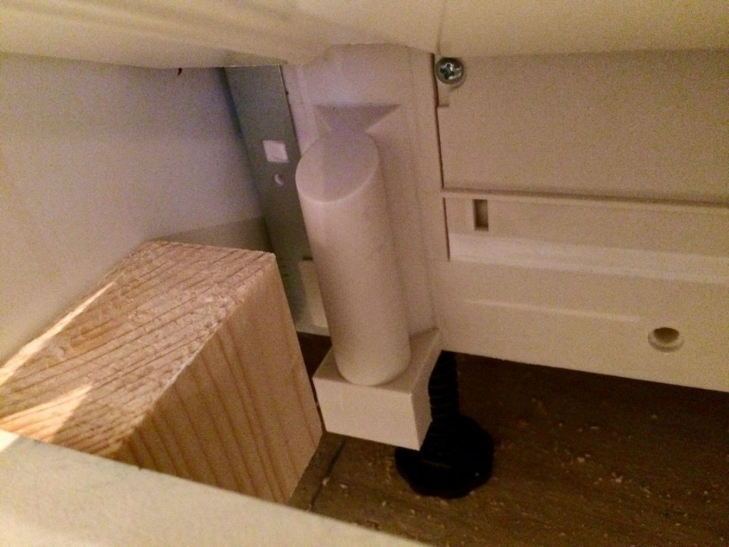 De rechterkant was ingewikkelder. Daar staat namelijk de koelkast, en die heeft geen wand waar je een blokje tegenaan kan schroeven. Ik heb een blok hout genomen en daar een gat in geboord. Dat gat was net zo groot als het witte buisje van de Indesit. Op 3/4 van het geboorde gat heb ik het blokje hout afgezaagd. Het kon toen precies van boven naar beneden over het buisje geschoven worden. Even uitrekenen hoe ver het blokje diende uit te steken om het Ikea plintje precies paralel aan het Ikea deurtje te laten lopen, op die lengte afzagen, en ook hier een flinke klodder lijm aanbrengen.