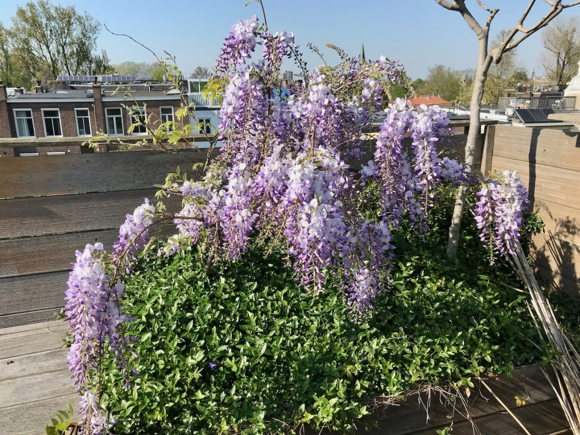 Annie had vorig jaar al eens over ditjes, datjes en een Blauwe Regen geschreven. Ik heb die plant lang geleden van een buurvrouw op de Willemsparkweg gekregen. Hij stond al jarenlang in een bak op mijn dakterras, groeide steeds een stukje verder, maar liet nooit het begin van bloesem zien.