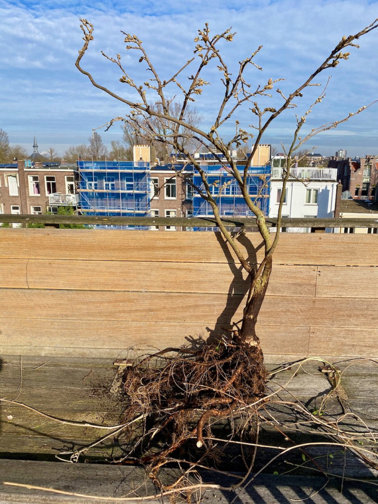 Tot vorig jaar. Vorig jaar knalden de bloemen uit zijn takken. Een hartekreet van de plant; hij wilde mee naar Haarlem.