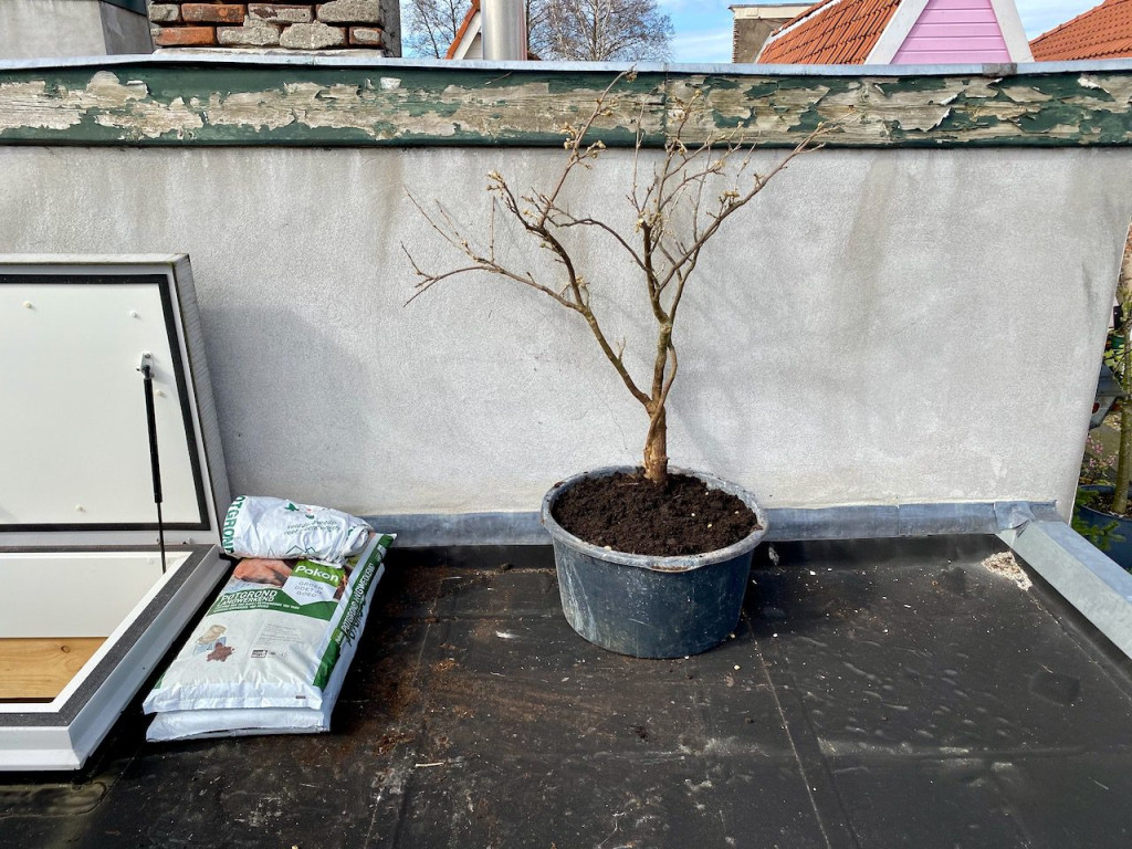 Geen dag meer te verliezen dus. Ik heb in het tuincentrum een paar zakken potgrond gekocht, in Haarlem stond een plastic metseltrog werkeloos te zijn, de keukenvloer moet een paar dagen drogen voordat ik hem in de bescherming kan zetten, het regende voor de afwisseling eens een dagje niet, het was vandaag de uitgelezen dag.
