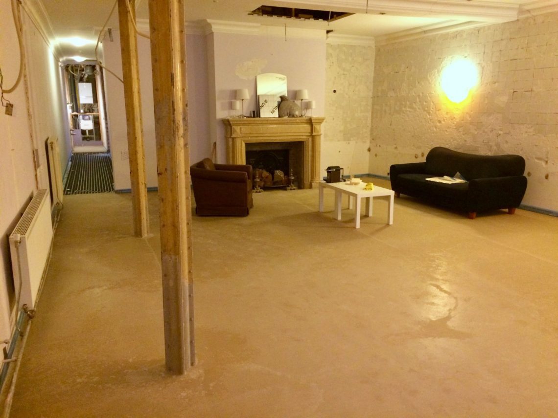 Mijn focus lag op het afwerken van de vloer. Er waren vorige week dammetjes door mij gebouwd, die heb ik vandaag weer afgebroken. Ook de bekisting rondom de open haard heb ik weggehaald. Het ziet er mal uit, zo’n verzonken haard, maar we gaan er vast en zeker aan wennen.
