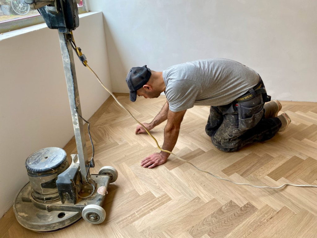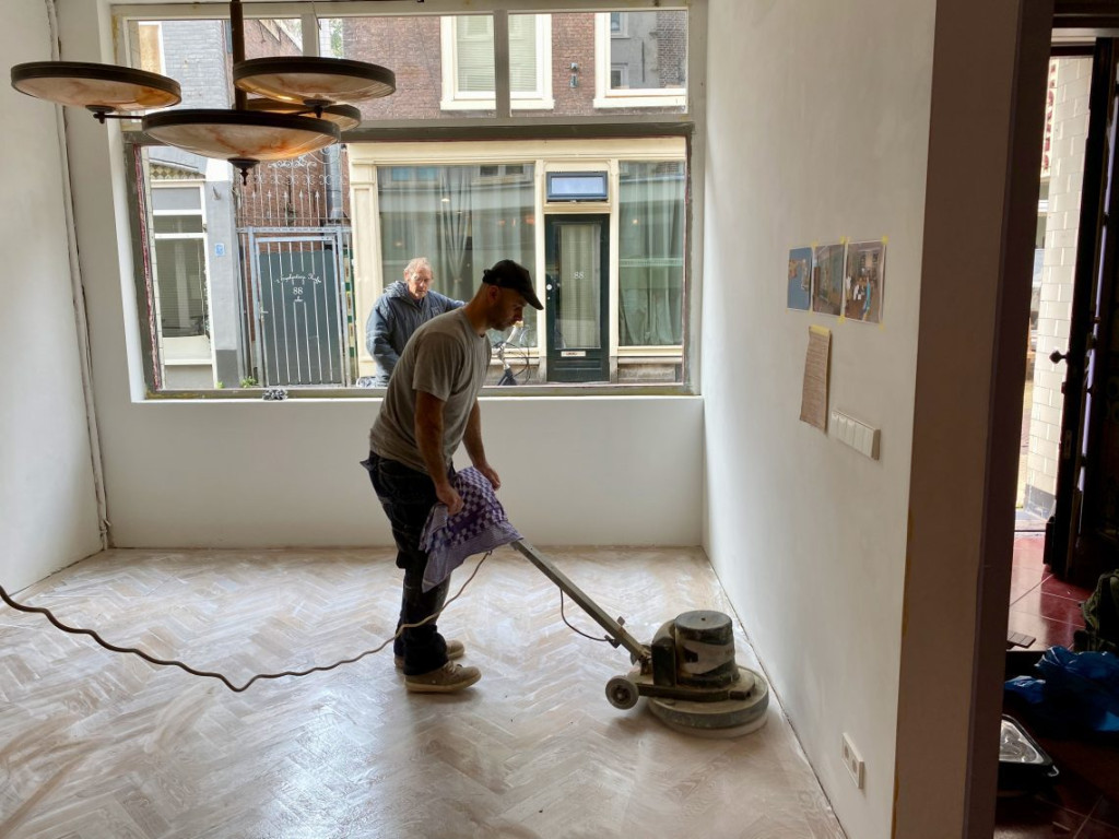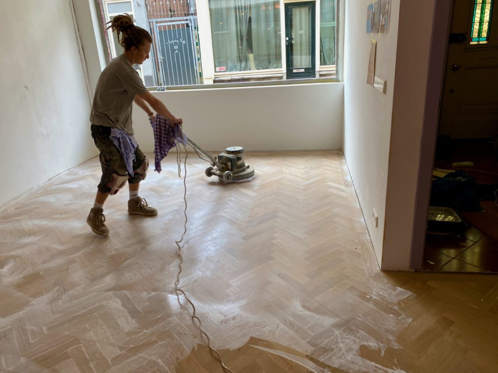 Met een schuurmachine (korrel 120) de hele vloer nog een keer zachtjes opschuren.