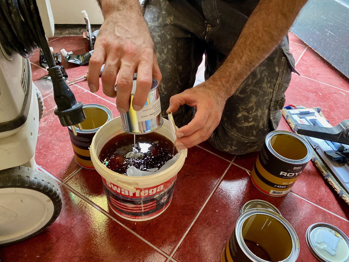 Als de vloer een half uurtje later droog is, gooi je twee potjes geheim spul in een emmertje speciale olie. Goed roeren, en je hebt een witte vloeistof.