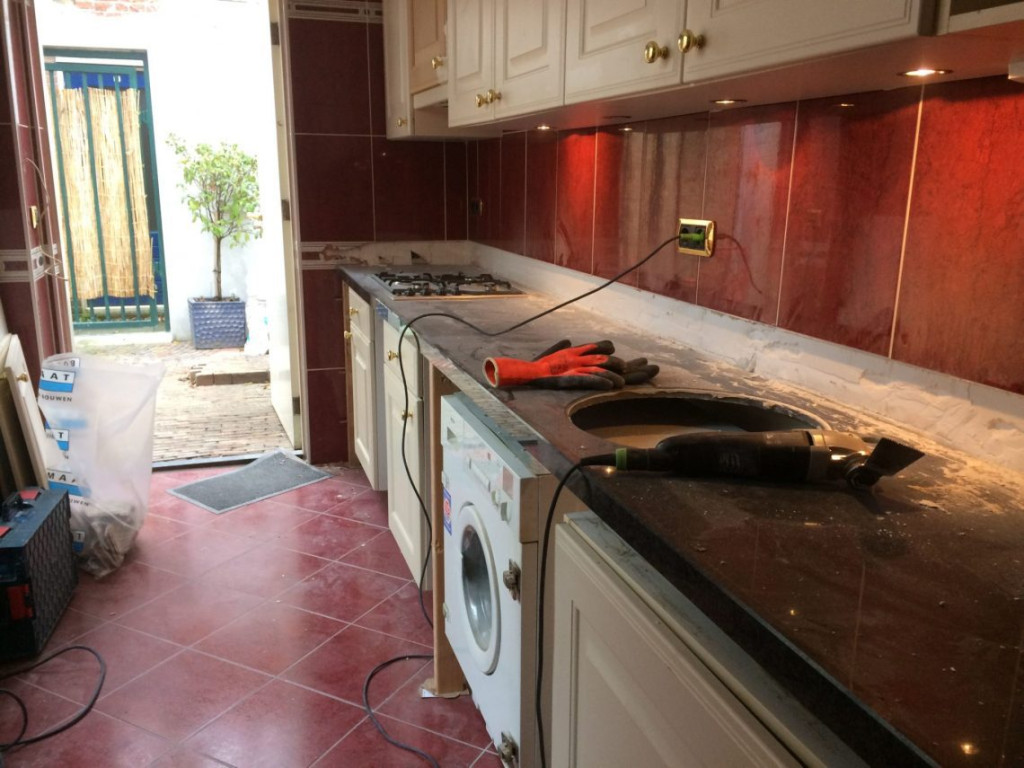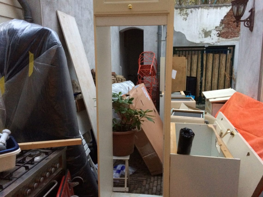 Ondertussen ging ik natuurlijk ook aan de bak. De bijkeuken moest kaal en leeg. In de ochtend zag hij er nog redelijk als een keuken uit.