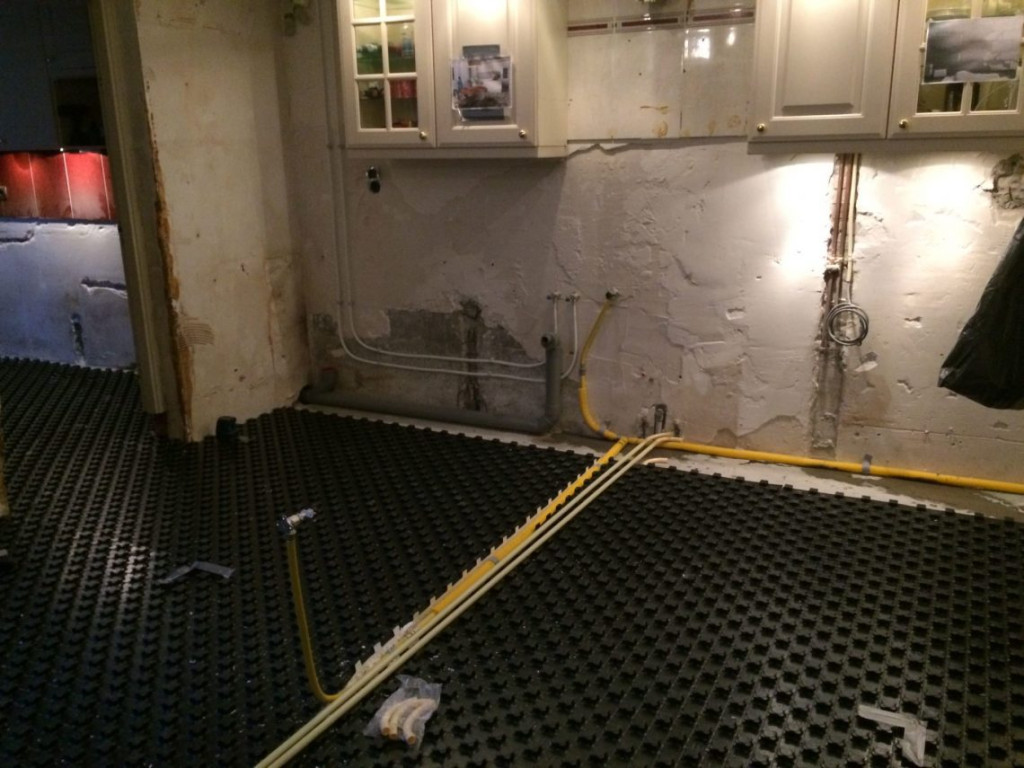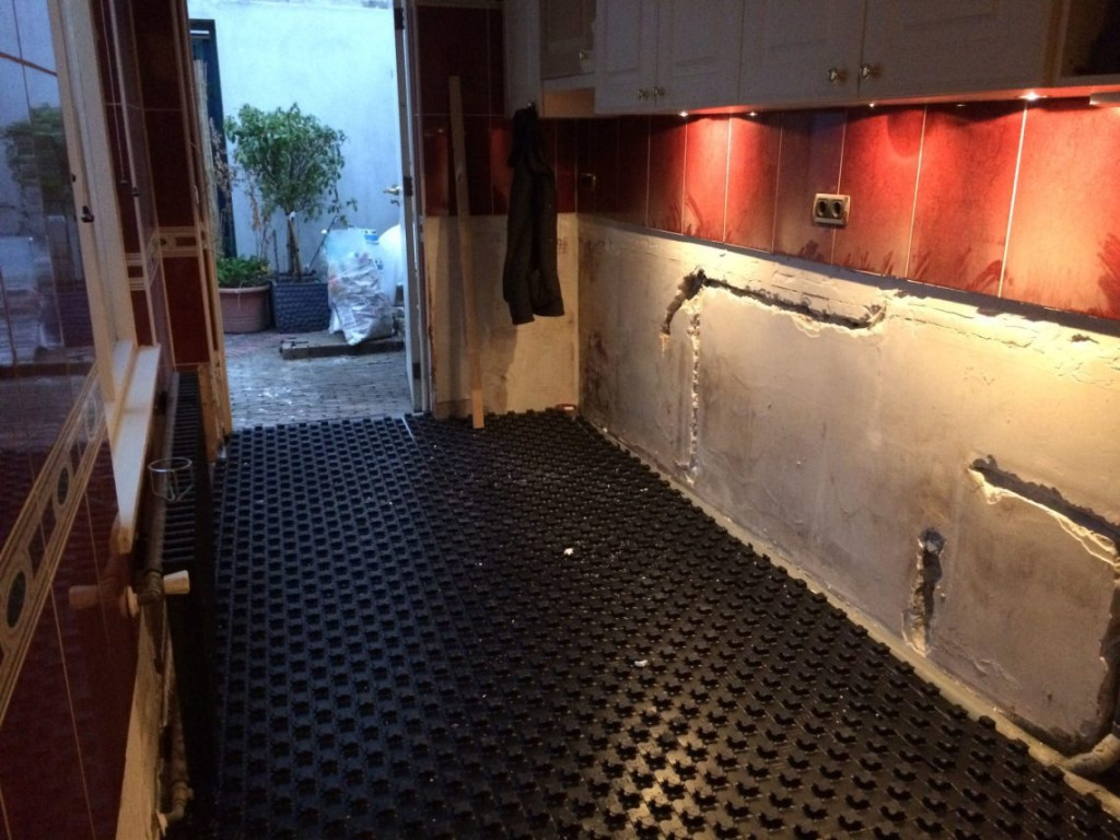Nadat ik gehakt en gebroken had, en nadat ik met krimpvrije mortel alle gleuven die er achtergebleven waren (omdat ik ook de oude afvoerleidingen gesloopt had) weer netjes had aangeheeld, en nadat Bart en Paco ook hier hun voorbereidend werk hadden gedaan, was het al een heel ander gezicht.