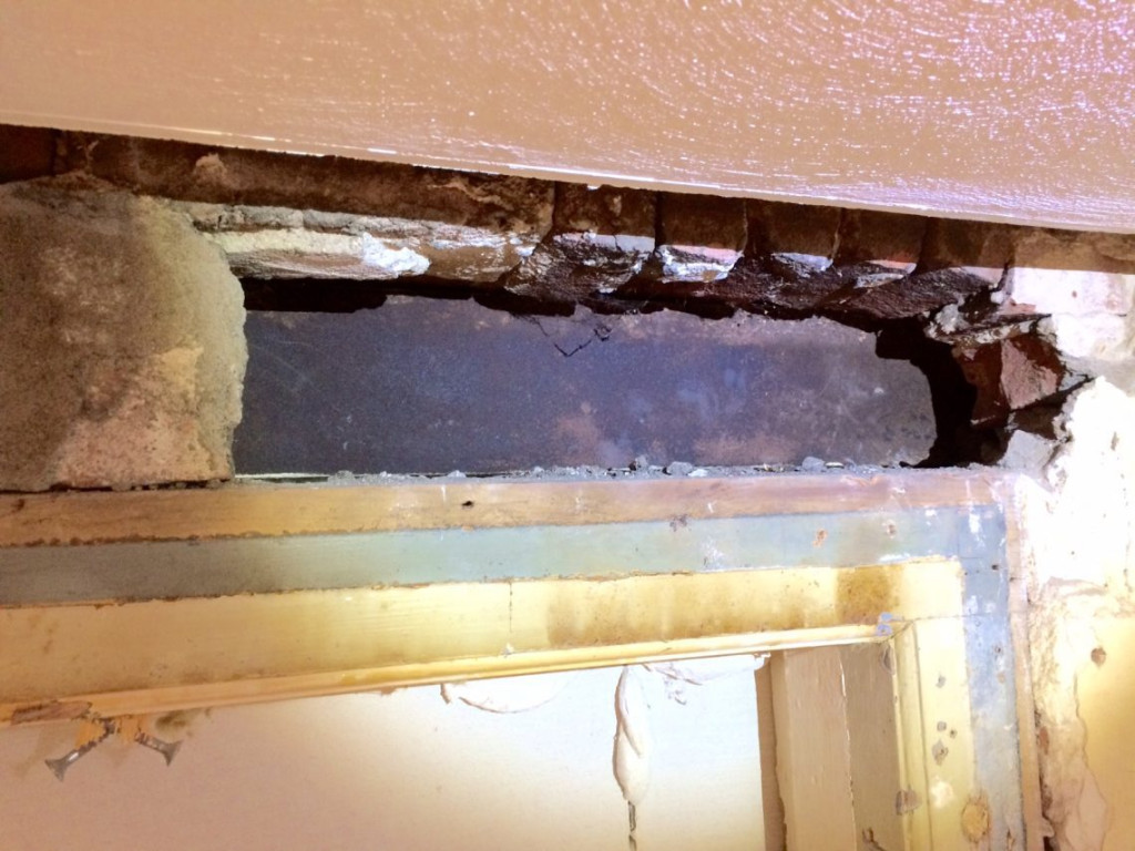 De U-balk ligt niet netjes in het midden van de bakstenen muur. Hij ligt vrij ver naar buiten. Dat betekent dat de buitenmuur voor ongeveer 15 centimeter op de balk rust. Daar moet je geen aardbeving mee krijgen, maar het stort ook zeker niet meteen in. Tot zover de geruststellende waarneming