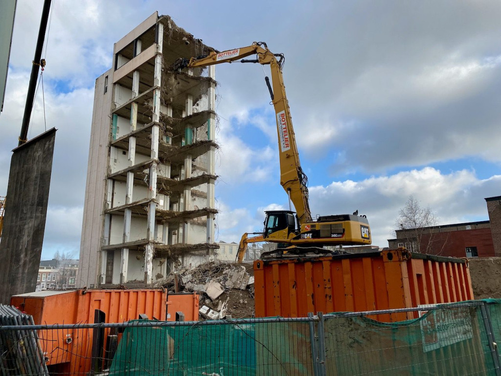 In het kader van de cursus loslaten voor gevorderden besloot ik een ommetje te gaan maken. Bij ons om de hoek stond altijd een heel lelijk groot wit flatgebouw aan het Spaarne. Dat wordt nu gesloopt. Ik heb er een tijdje naar staan te kijken, en kwam weer helemaal tot rust. Zo’n project zou ik ook wel eens willen doen. Met een enorme happer brak de machinist flinke stukken vloer uit het karkas. En niemand die daar over stof klaagde.