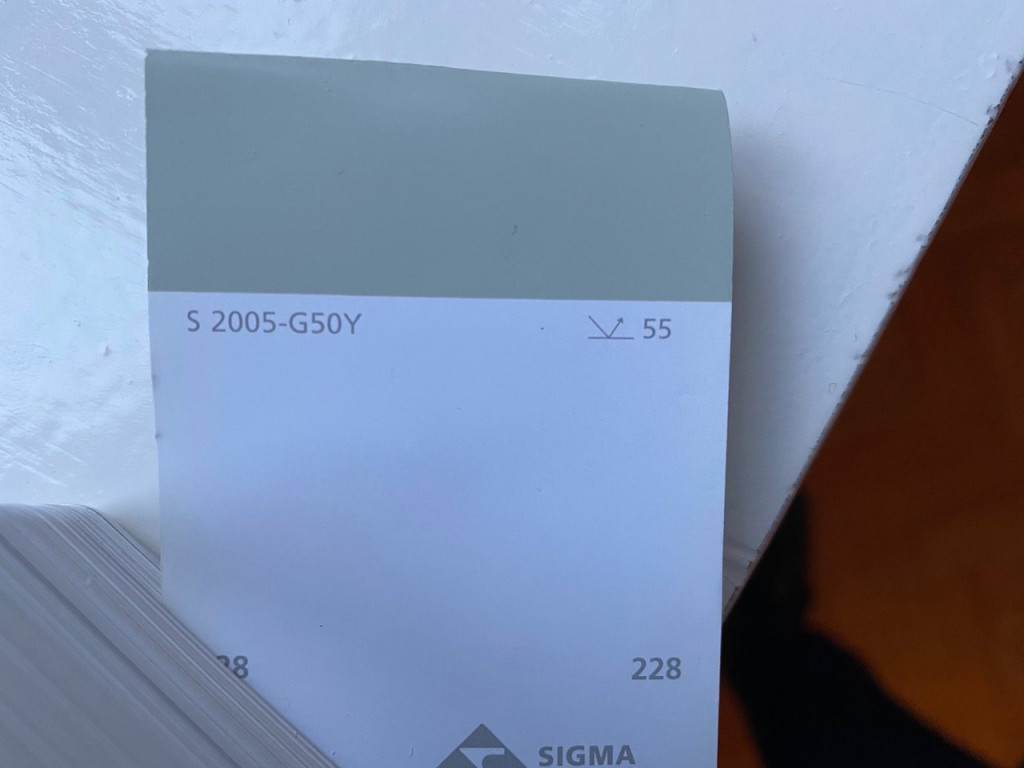 Uit de kleurenwaaier van Sigma had ik thuis al de kleur gezocht die het meest op onze “Mizzle” van Farrow and Ball leek.