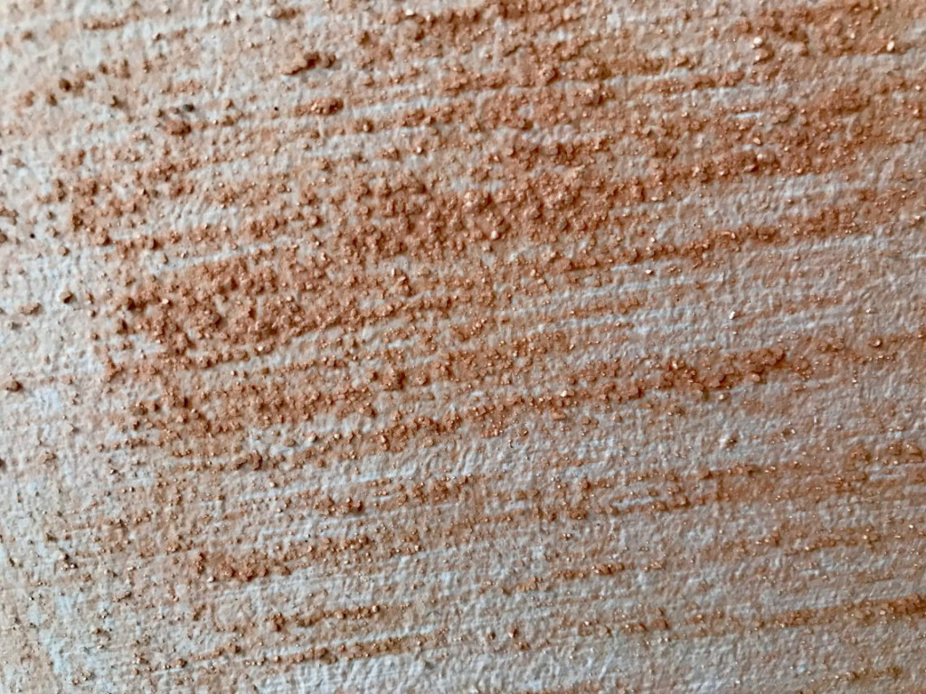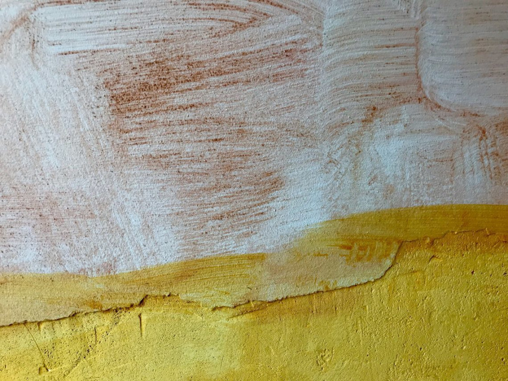 Aan mij de leuke taak om de zuigende muur in de stucprimer te zetten (= geel) en de andere stukken muur in de betonprimer. Ook wel Betocontact genoemd. Betocontact is roze en er zit een soort zand in. Het lijkt op scrubcreme. De truc is het zo gelijkmatig mogelijk op de muur aan te brengen, zodat de stuc vervolgens goed kan vastgrijpen in het zand.