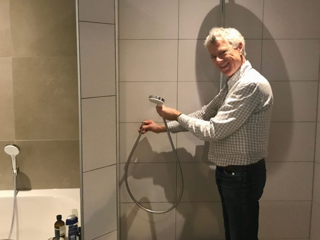 Hessel wil het liefste de douchekop gewoon uit het plafond hebben, met de kranen uit de muur en boven de kranen een uitsparing voor de shampoofles. Wij willen liever niet zo’n heel stangencomplex aan de muur.