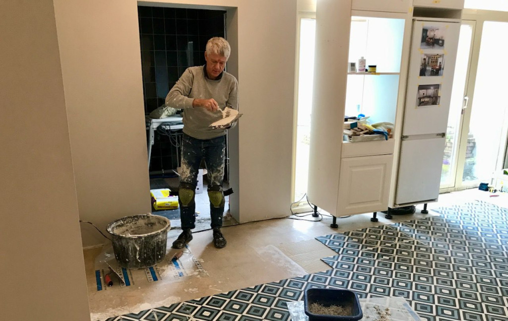 Hessel maakte nieuwe lijm (halve zak) en ging druk met de vloer in de weer.
