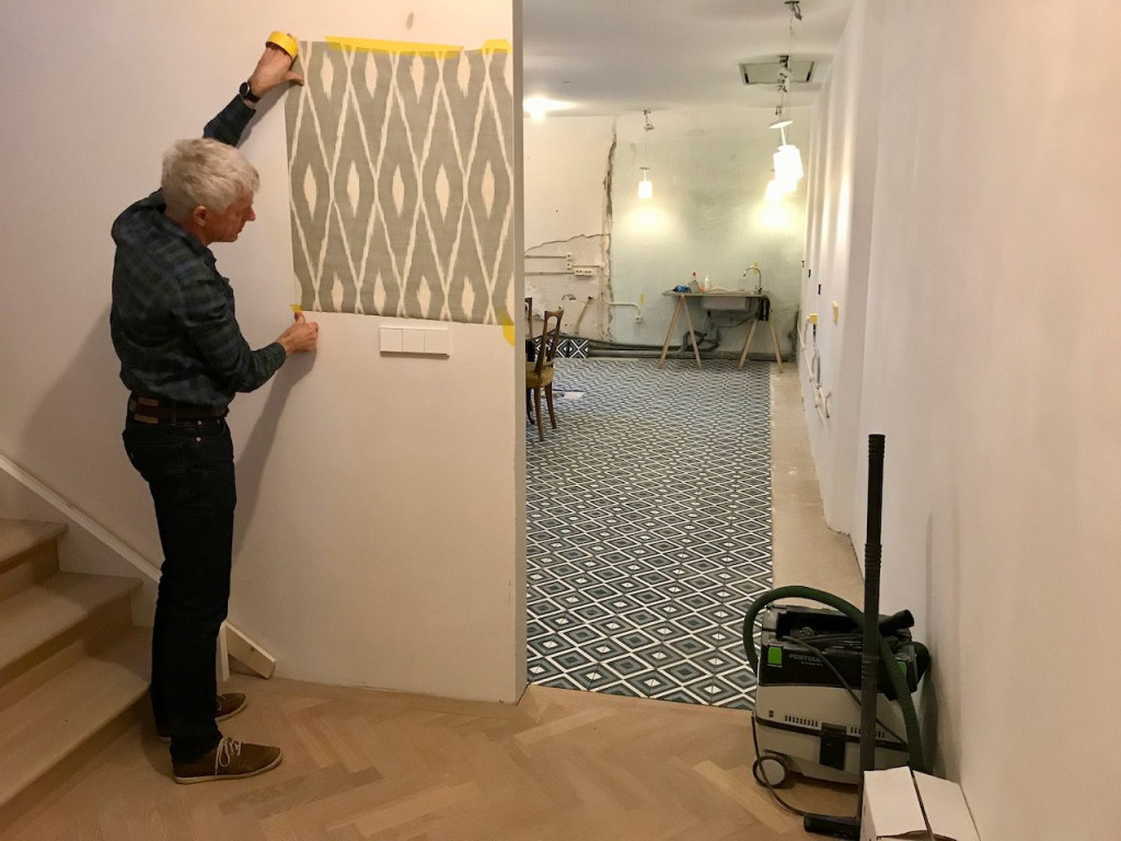 Aan het einde van de dag was Hessel helemaal op schema met de vloer en testen we even of het behang van het trappenhuis nou echt zo druk is bij de vloer…