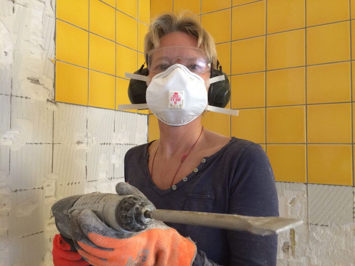 Annie is de hele week keihard aan het werk op het reclameburo, en is nog maar nauwelijks hier in haar eigen Haarlemse huis geweest. Voor haar is het nu nog een beetje abstract bouwproject, en ze had reuze zin om zich het huis eigen te maken door flink wat meters gele tegel te lijf te gaan. Dat deed ze voorheen met een hamer en een handbeiteltje, en zo vorderde ze langzaam maar gestaag. Een heerlijk schoon werkje, met als enige troep na afloop een bergje gebroken tegels. Maar vandaag introduceerden we de elektrische klophamer van Hans van Rijs. Een monster. Reuze zwaar, maar dat bleek voor Annie helemaal geen bezwaar te zijn. Ze schoot door de tegelwand heen. Wat onverwacht tegen viel, was de hoeveelheid stof die ze er mee produceerde. Je zag geen hand meer voor ogen.