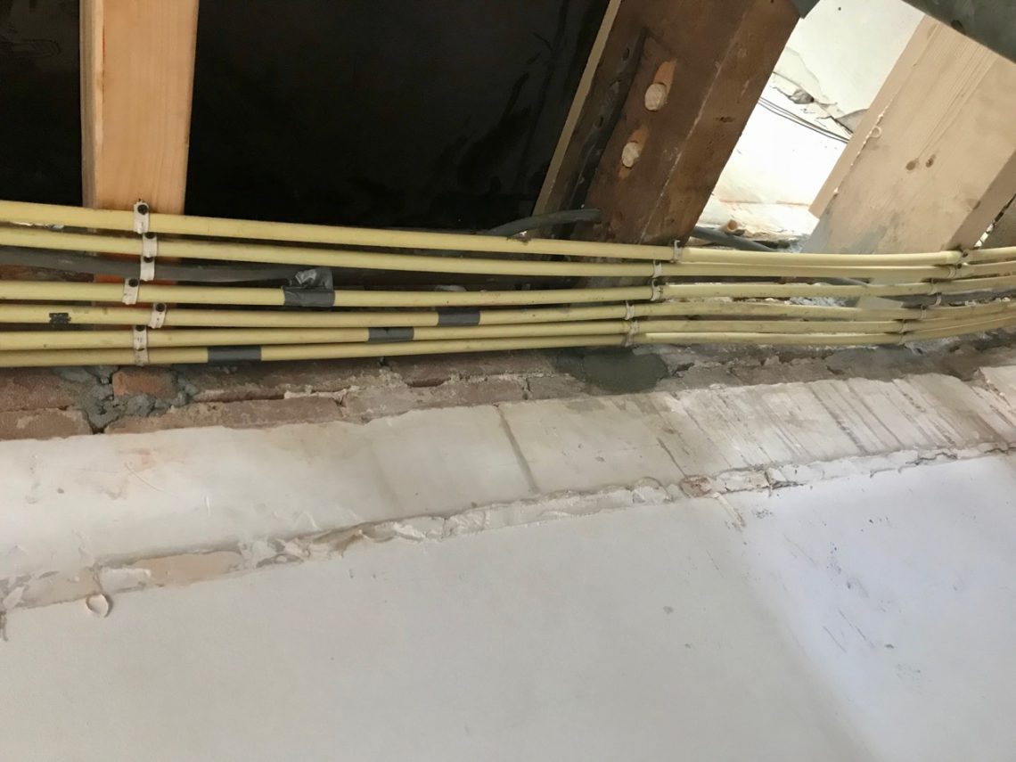 Op de bovenste foto zie je de spaghetti van elektraleidingen die ik heb geordend en netjes onder de balken heb vastgezet.