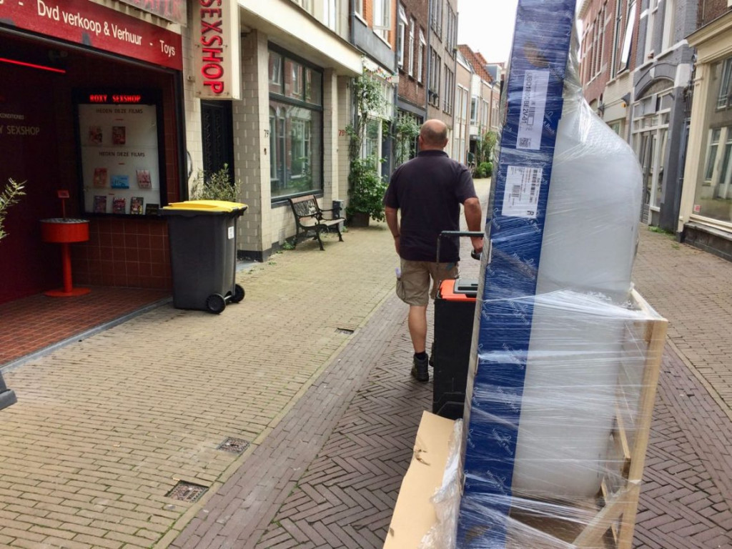 Tijd om eens wat gaten in het plafond te gaan boren. He, verdorie, wie belt me nu op? Een onbekend nummer. Het was de chauffeur van badkamer.nl. Als mij dat zou uitkomen, dan kon hij over een half uurtje nog wel even langskomen om de spullen te brengen. Natuurlijk kwam mij dat uit. Wat ik niet verwachtte, was dat hij een half uurtje later opnieuw zou bellen. Zijn vrachtwagen was te groot om onze straat in te kunnen. Of ik even kon helpen op de Gedempte Oude gracht? Daar had hij zijn tientonner midden op de kruising gezet, het verkeer stond tot aan het Spaarne vast.