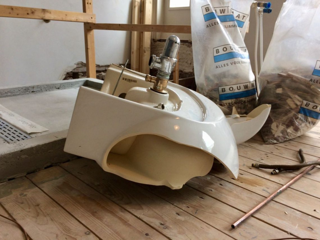 Vanochtend besloot ik dat ik pas verder kon werken, nadat ik alle puin van gisteren opgeruimd had. Toen alles schoon was, was de dag al behoorlijk ver gevorderd. Eindelijk zou ik de nieuwe gaten in het plafond gaan boren, waar straks onze badkamerspotjes in geplaatst worden. Er was een echt plan, heel precies uitgerekend. Ik begon op het keukentrappetje met centimeter en viltstift bij het spotje vlak bij de tijdelijke wastafel. Eigenlijk kon ik niet goed bij het plafond. Zou ik met mijn voet lichtjes op de wastafel kunnen steunen? Als ik dat voorzichtig deed? Even leek het goed te gaan, toen volgde een enorme knal, en lag de wastafel op de grond. De afvoerpijp was afgebroken, en de rare waterleidingen, die ik tijdelijk aan de oude leidingen geknoopt had, waren verbogen, maar lekten gelukkig niet. De wastafel was voor de toekomst onbruikbaar, want lag in duizend stukken.