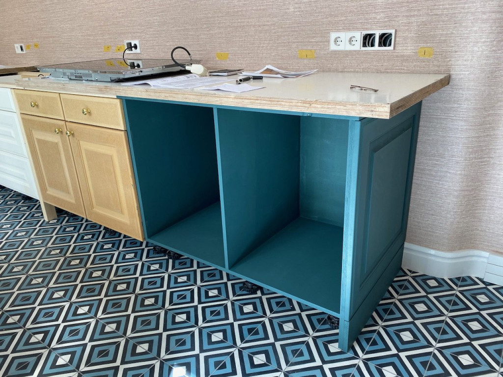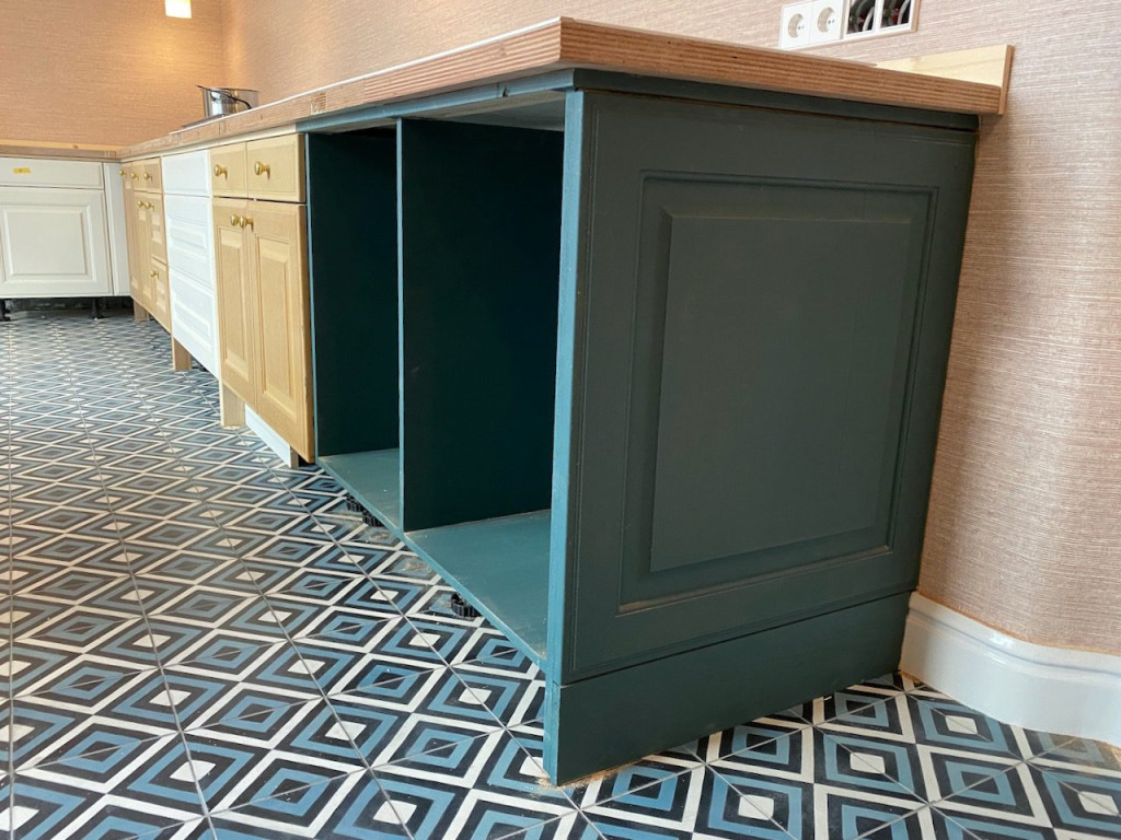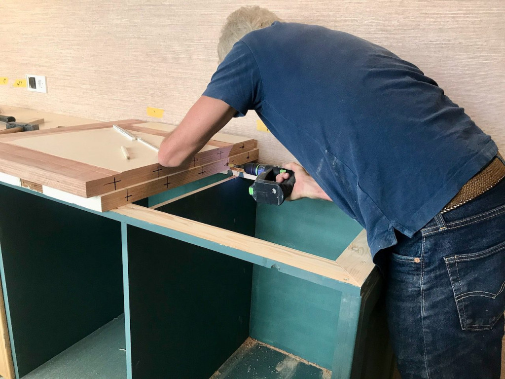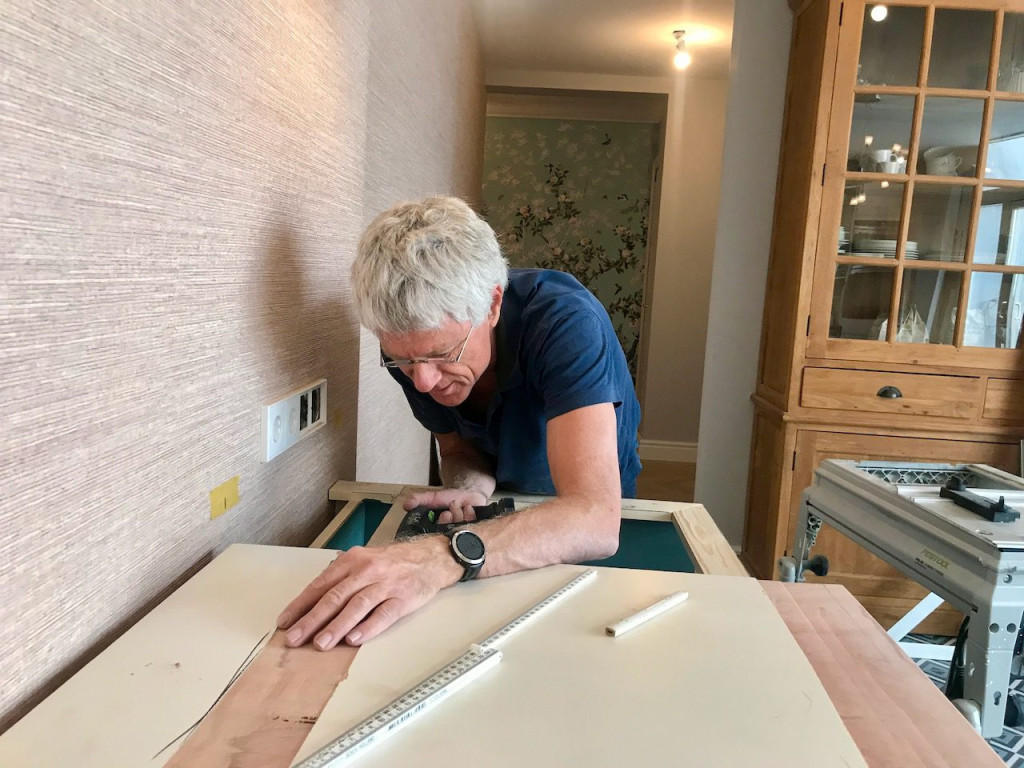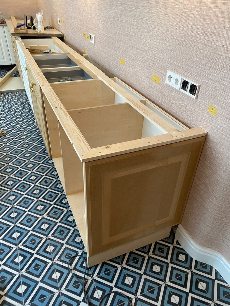 Het houten frame diende twee doelen. Het hield de hele zooi aan oude kastjes goed bij elkaar en zorgde er ook voor dat er onder het aanrechtblad een mooi randje zou ontstaan, wat de keuken een klassiekere uitstraling zou geven.