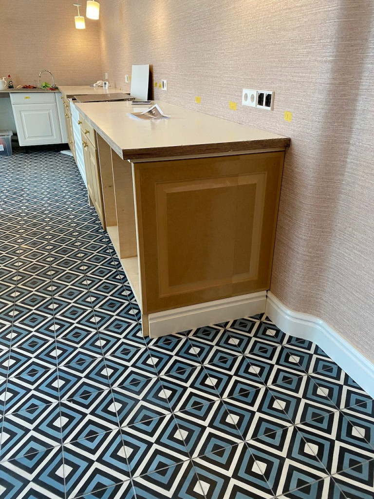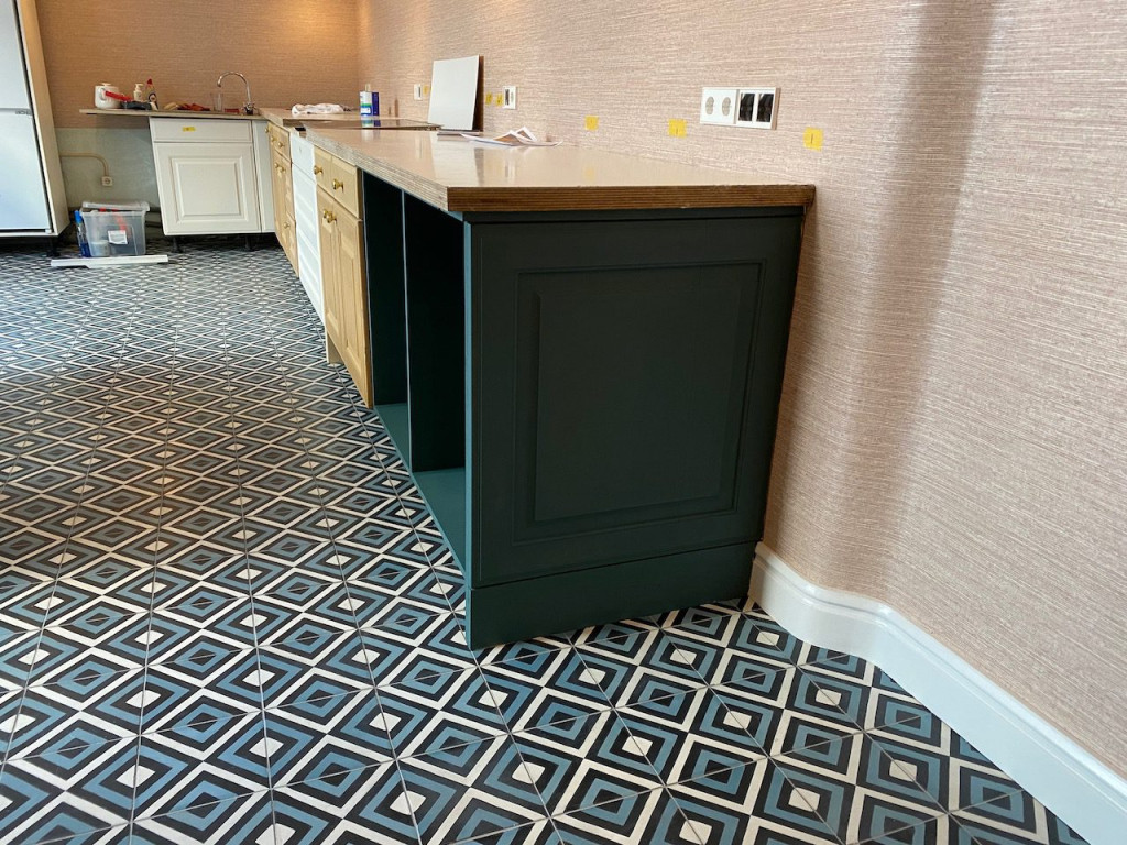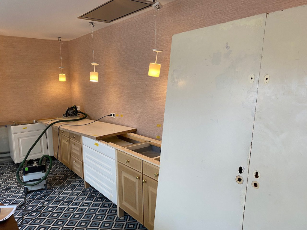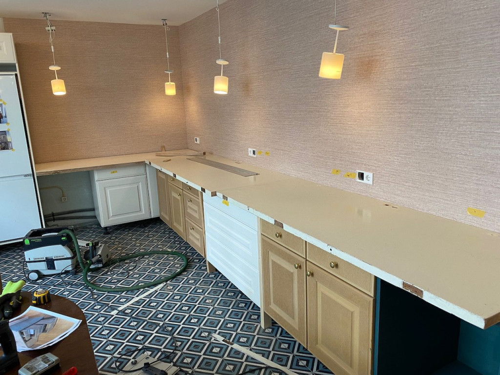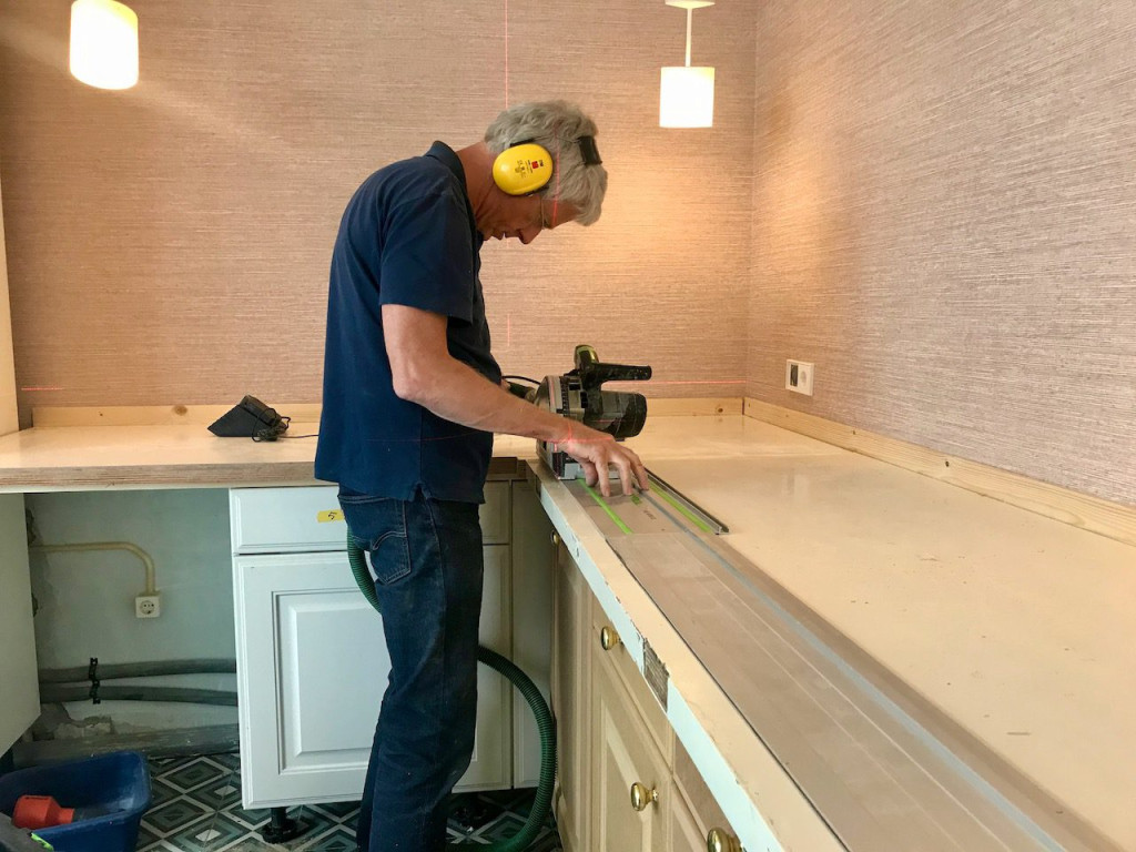 De hele keuken wordt opnieuw geschilderd, het aanrechtblad wordt met Epoxy giethars afgegoten.