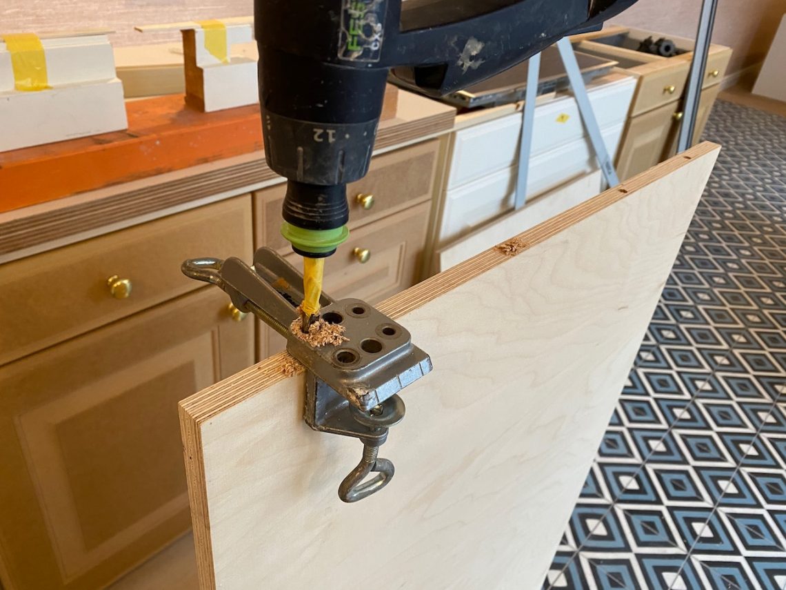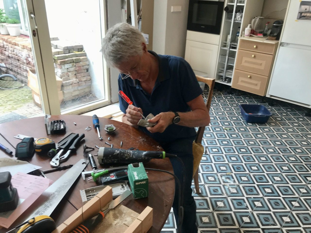 Bij de Bouwmaat was het berken multiplex al exact op maat gezaagd. Haak gebruikte een ouderwetse deuveltechniek in combinatie met de allermodernste lijmen om de onderdelen in elkaar te zetten.