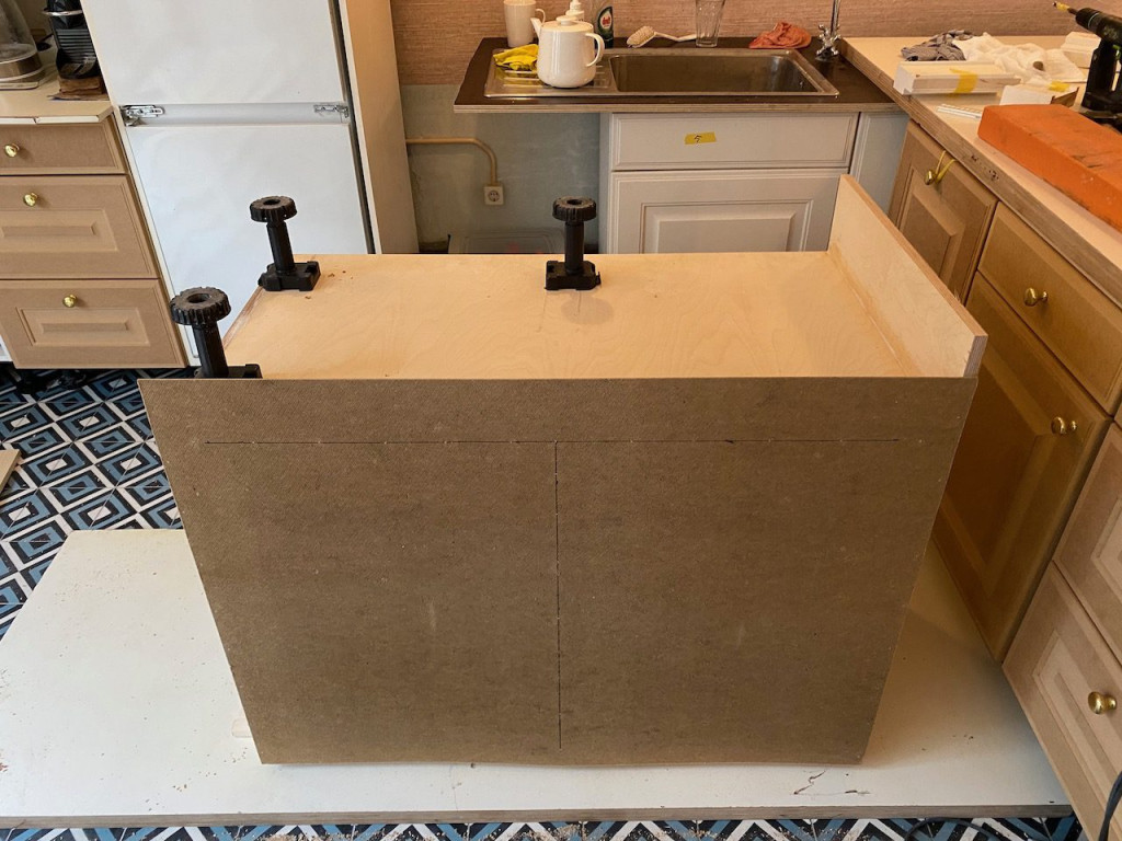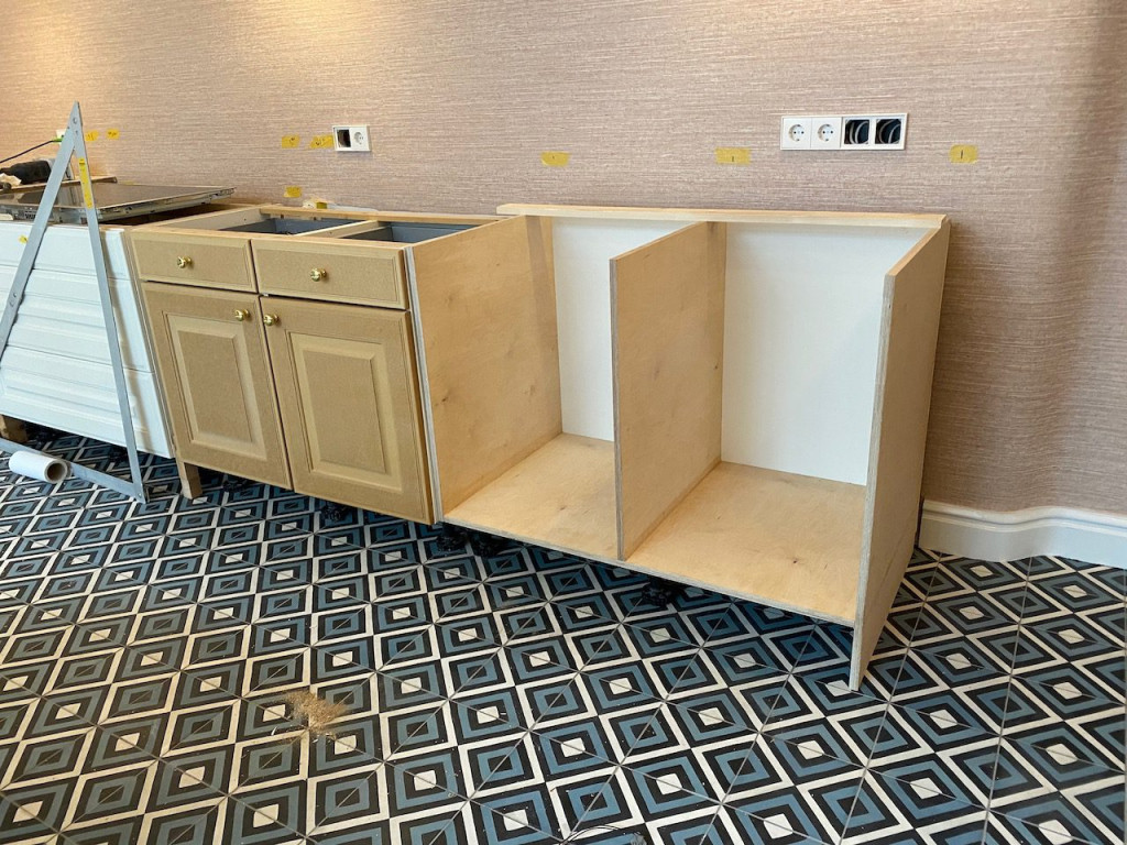 De andere kastjes werden nu allemaal met de stelpootjes op gelijke hoogte gebracht. Over het hele oppervlak monteerde Haak een houten frame. Twee oude MDF deurtjes werden op zo’n manier in stukken gezaagd, dat ze met elkaar samengevoegd een paneel vormden wat precies op de zijkant van het aanrecht paste. Ze werden met BisonTix verlijmd.