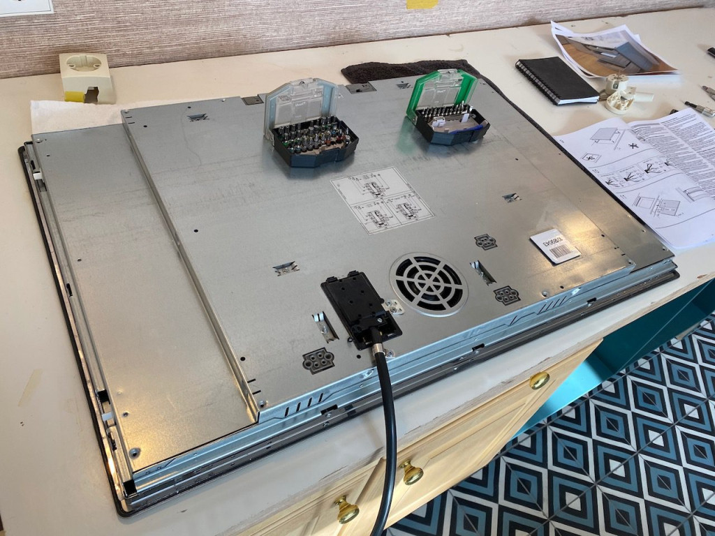 Tijdens de voorbereiding van deze keuken zijn er diverse inspraakrondes geweest. Onlangs is met meerderheid van stemmen besloten om de keuken pootjes te geven. Haak monteerde een pootje en legde de inductiekookplaat op zijn toekomstige plek.