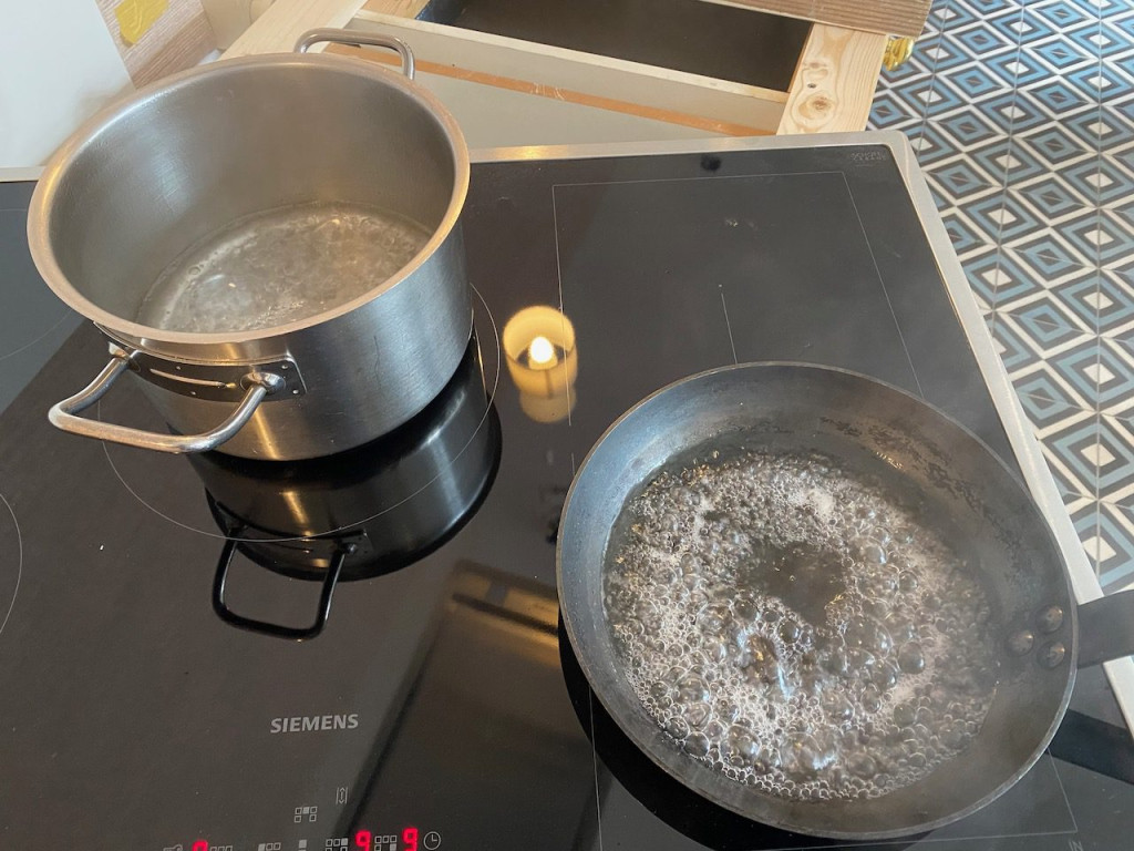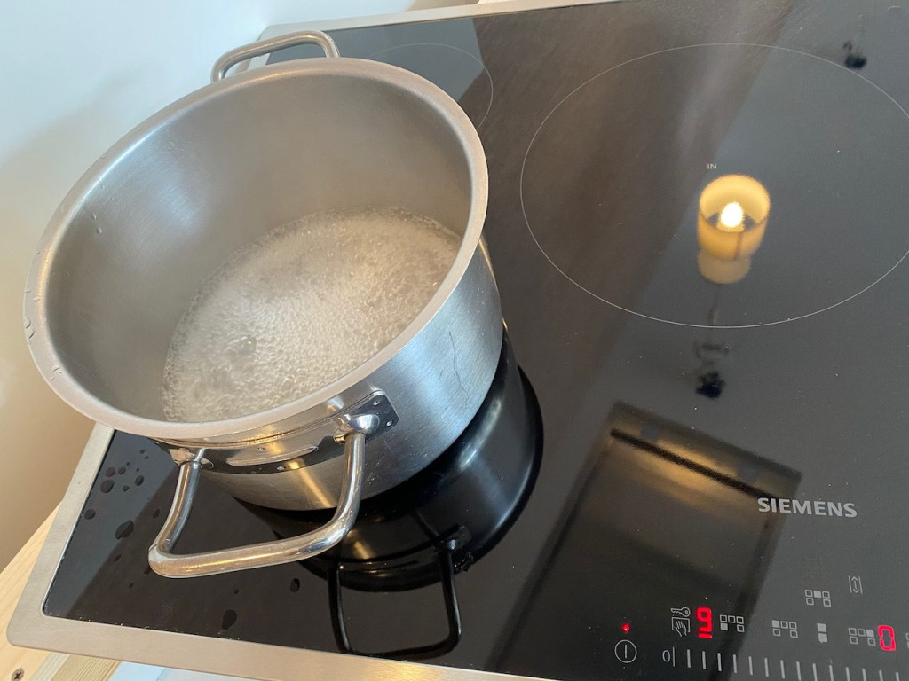 Hij zette een pan op het glas en klikte voor het eerst van zijn leven op een knop van een inductieplaat. De lichtjes gingen branden. Niet veel later kookte het water. Wat een heerlijk gezicht.