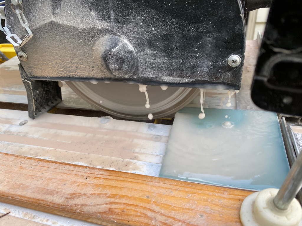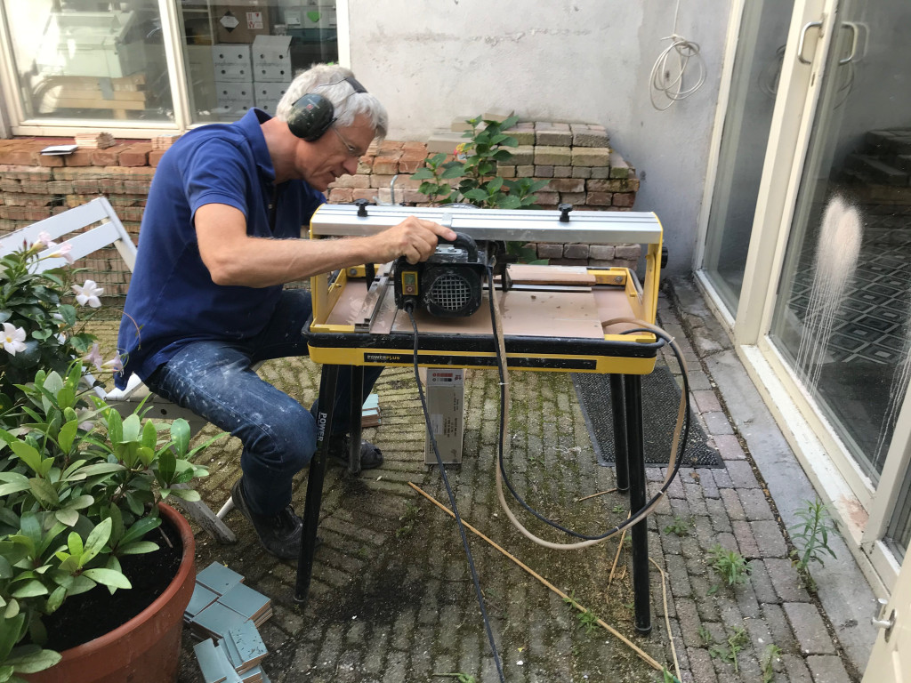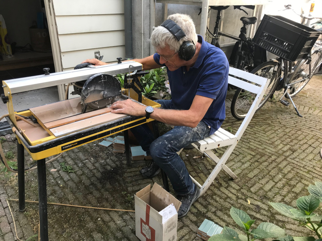 Nu dat de drie grote wanden betegeld waren, moest ik me gaan voorbereiden op de deuropening met bijbehorende hoekjes. Daarvoor moesten er een paar honderd zaagsnedes gemaakt worden.