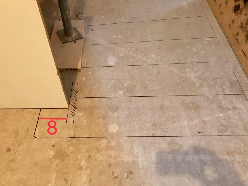 Ik heb alle maten met een viltstift op de grond uitgetekend, om te zien of echt alles zou kloppen. De bloktrede (dat is de onderste trede, die iets breder is dan de rest) was een stukje te groot vond ik. Snel een foto gemaakt, de voorgestelde nieuwe maat in de foto aangegeven, en aan Jan teruggestuurd.