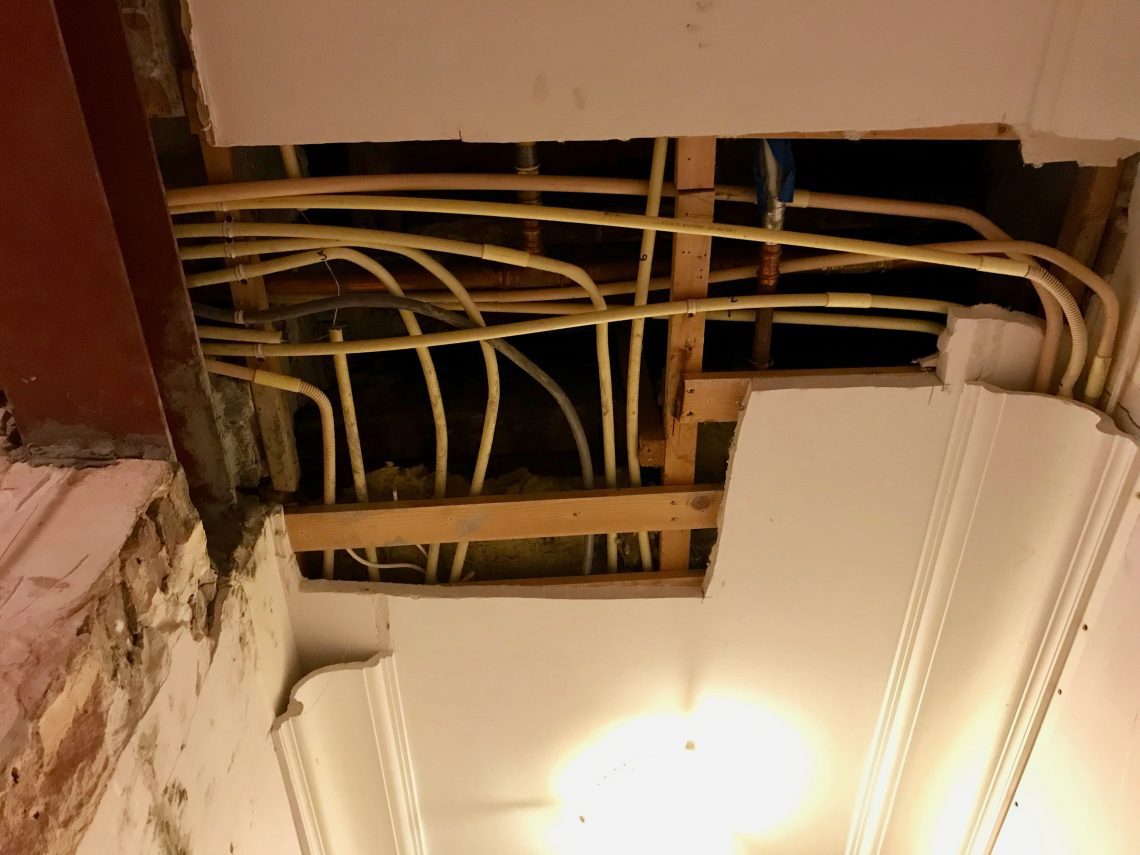 Al met al gaat het er best wel netjes uitzien. De nieuwe leidingen lopen door de nieuwe gleuven in de gerepareerde muur, klaar om dichtgesmeerd te gaan worden.