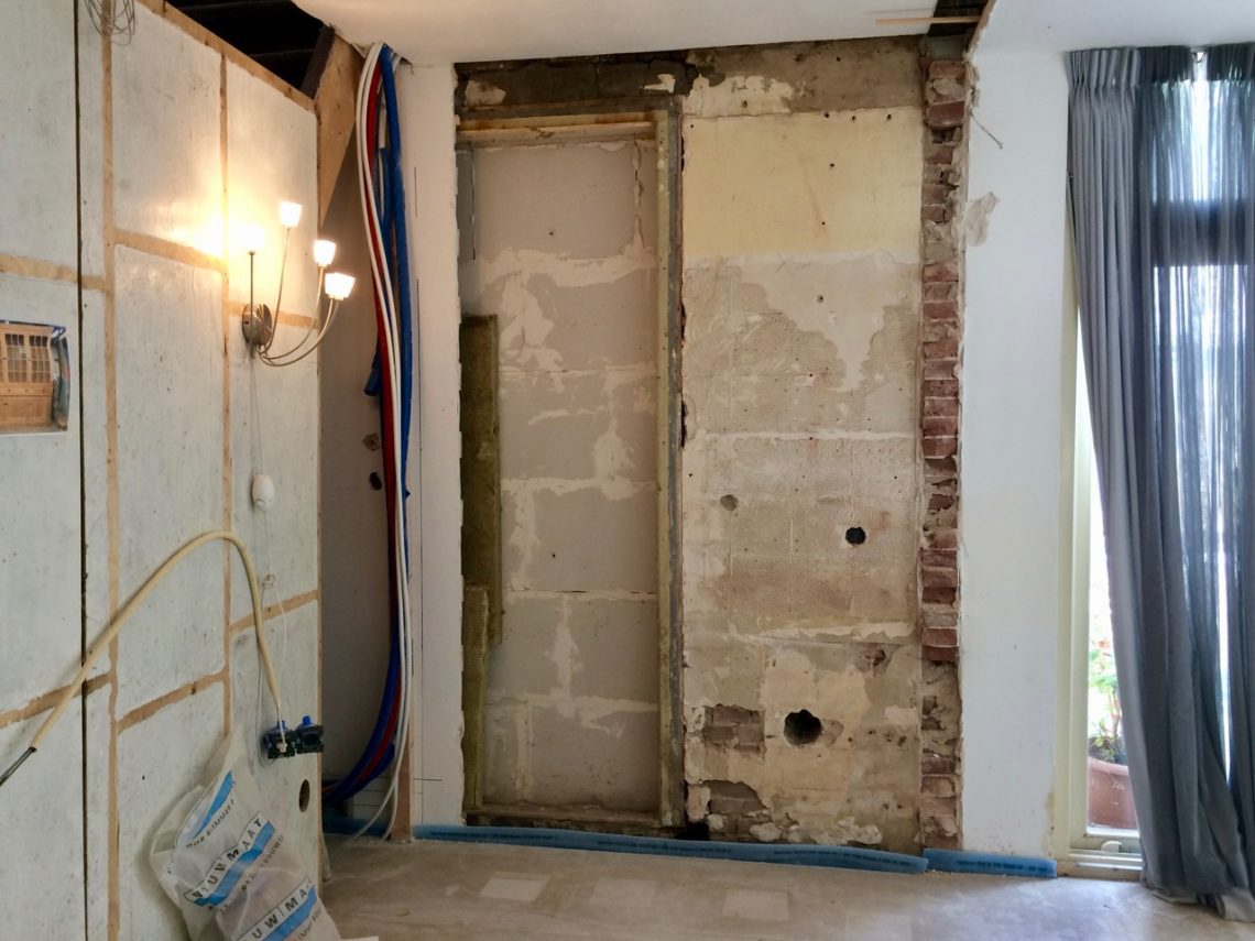 Op de volgende foto heb ik de betegelde wand gesloopt en is de antieke deurpost goed te zien. Van de radiator zijn alleen de aan- en afvoerleiding nog over. Aan de keukenzijde kijken we tegen de achterkant van het voorzetwandje.